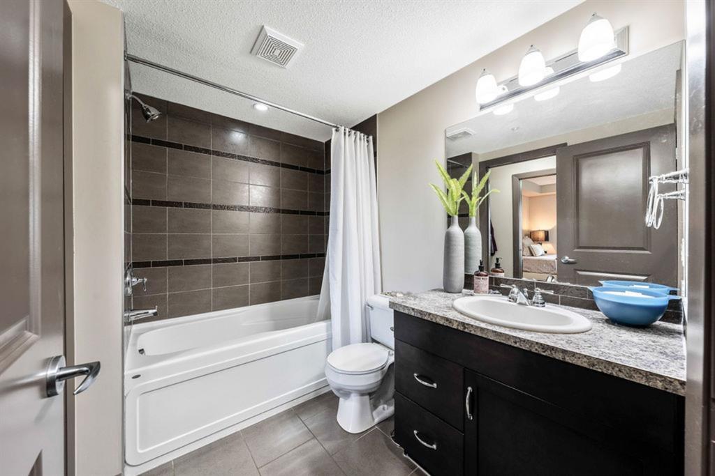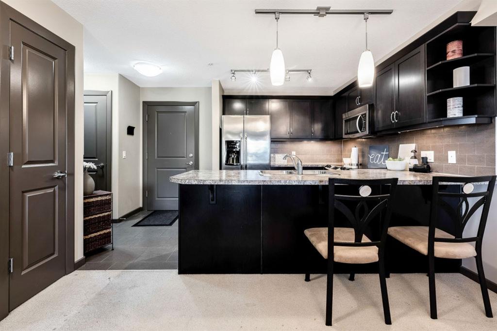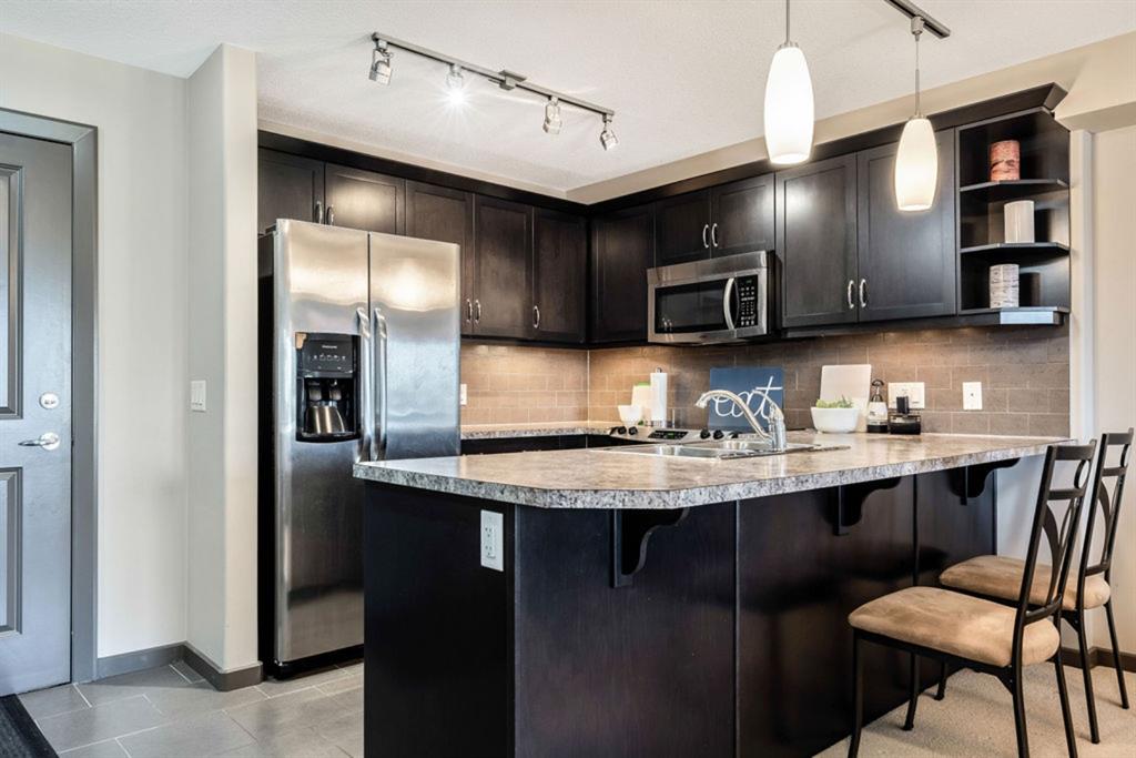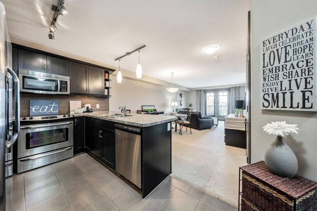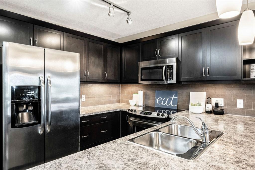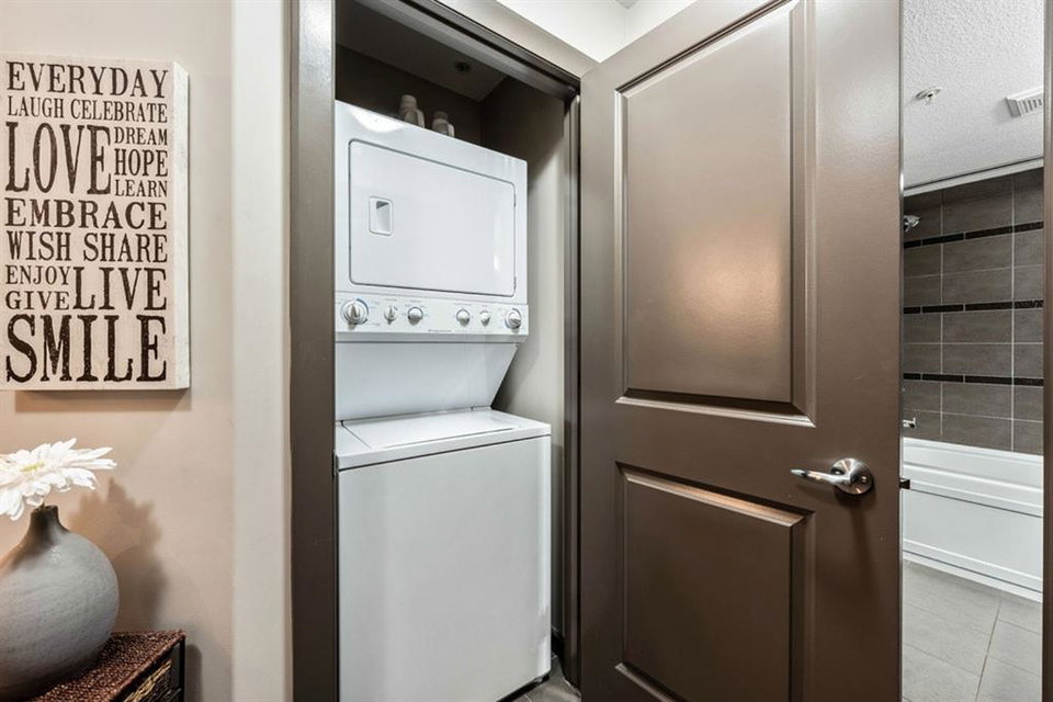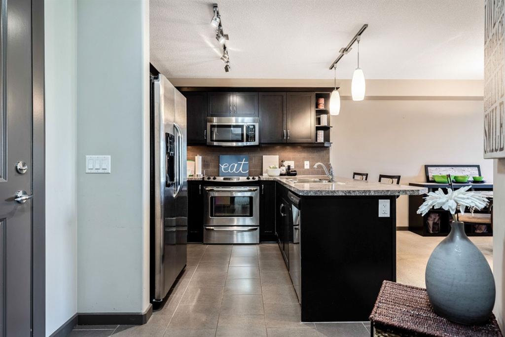 The fabulous one bedroom + den, second floor condo, is located in the wonderful community of McKenzie Towne. Interior features of this unit include a modern kitchen with tiled floor & backsplash, dark maple cabinetry, under cabinet lighting, stainless steel appliances and breakfast bar, neutral paint throughout, large windows for maximum natural light, garden doors leading to a spacious balcony off living area, in-suite laundry and an oversized master bedroom with walk-thru closet and cheater door to 4 pc bath. This unit also has storage locker in parkade, AND additional titled storage located conveniently across the hall from the unit! Located minutes from shopping amenities of High Street, transit and community sport courts. Great purchase for a first time home owner! Note – Condo building includes an elevator!
