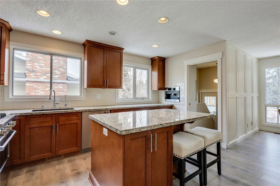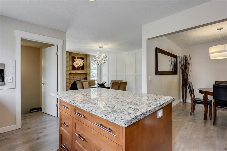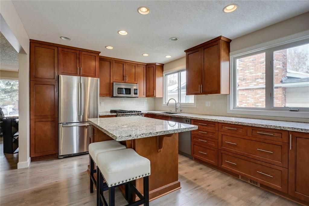 Absolutely BEAUTIFUL 1447 sqft BUNGALOW located in the heart of Canyon Meadows!! This fabulous home features gleaming hardwood floors, open concept floor plan, huge living room, dining area, renovated kitchen with high end appliances (Viking gas stove & microwave, Miele coffee maker), granite counter-tops, under mount sink and large island perfect for everyday living. Three generous sized bedrooms with a full ensuite off the master bedroom & walk-in closet, newer 4 pc bath and wood burning fireplace. Basement is fully developed that includes a large family room, wet bar, 4th bedroom, 3 pc bath, storage room, fitness room and laundry area. Backyard is fully landscaped with custom two tier deck, newer fencing and stamped concrete walkway. Note: High efficient furnace, central A/C & oversized double attached garage. Short walking distance to all levels of schools, public transit, LRT, fitness center, shopping, Babbling Brook Park and Fish Creek Park. Beautifully well-kept home with pride of ownership!!