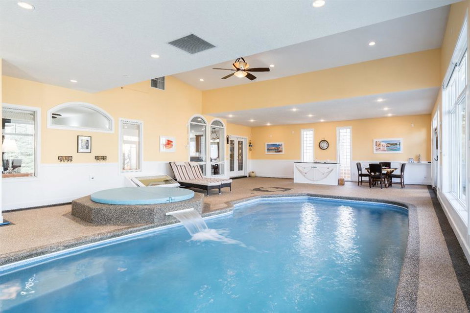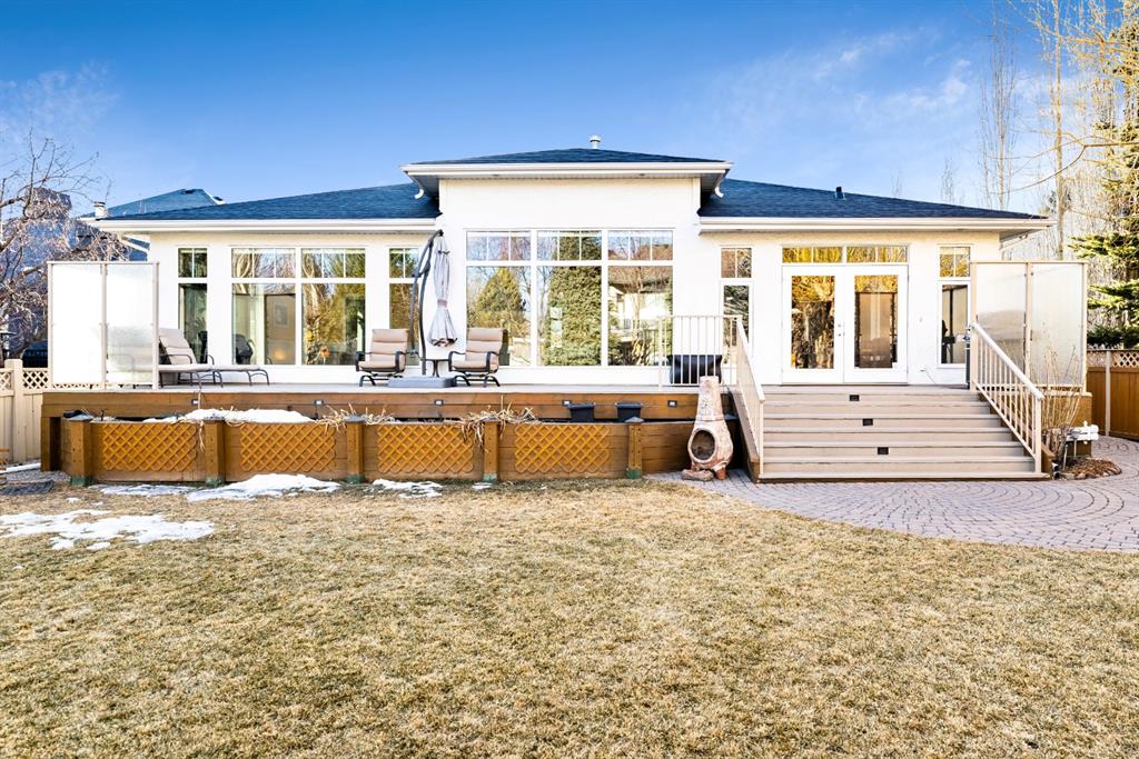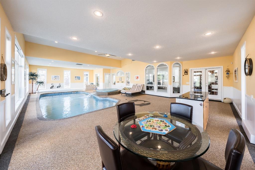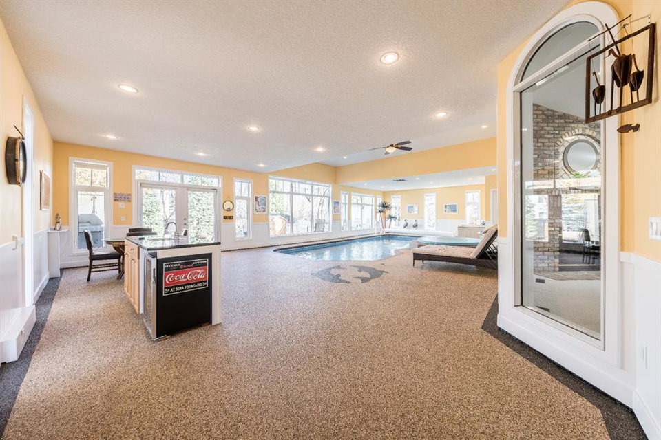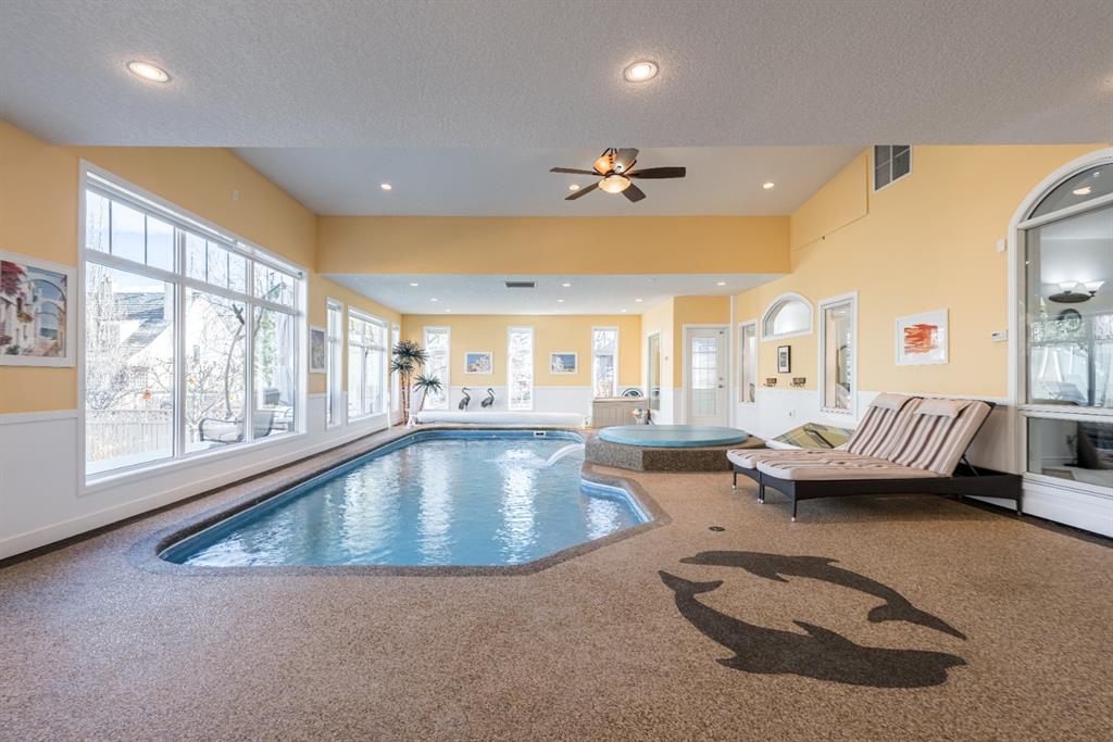 Enjoy your own piece of Paradise in this executive custom-built bungalow featuring a gorgeous “indoor low maintenance salt water pool” and hot tub – ideal for family and friends entertaining. Situated in one of Calgary’s premier communities just steps from Fish Creek Park and the Private Canyon Meadows Golf and Country Club with easy access to downtown and all amenities. This truly is a rare find! Open, bright, modern concept floorplan. Highlights include vaulted ceilings, front sitting room, gourmet kitchen/huge working island/breakfast bar, loads of granite counter tops and custom cupboards, large dining area. Family room has a stunning Old Chicago Brick gas fireplace. French doors open onto an expansive primary bedroom suite/sitting area with 5pc ensuite and walk-in closet. There is a second bedroom with 4pc guest bathroom and large laundry/mudroom equipped with sink, cupboards and closets on the main floor. Professionally developed lower level has a wonderful layout, under slab heated floors, oversized windows. Large open areas featuring TV sitting space with second fireplace, exercise equipment room area, games room that can accommodate a pool table plus other sports tables, wet bar with built-ins – creating a fabulous setting for family living, fun and entertaining. Third massive bedroom and fourth bedroom share a 4pc bathroom, den/office/hobby room, storage room and utility room complete the basement development. The enormous beautifully treed and landscaped yard offers great outdoor living spaces featuring a deck that is the full length of the home and a quiet retreat area with garden swing. Triple attached heated garage with numerous built-ins and extra parking space on a long driveway. Spectacular Home! Spectacular Location! Once in a lifetime Opportunity!