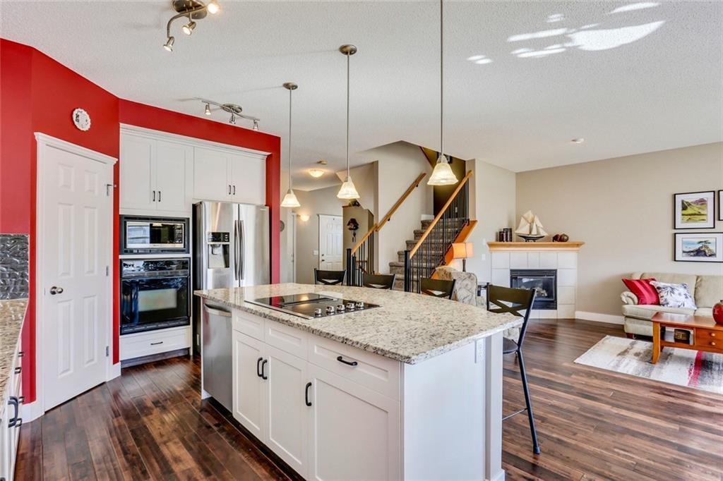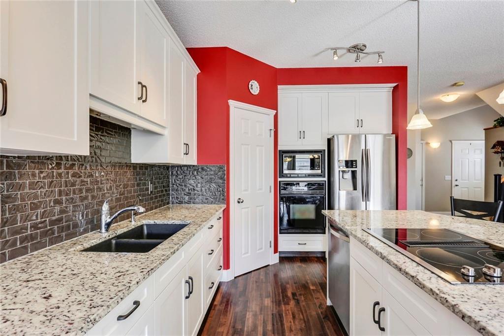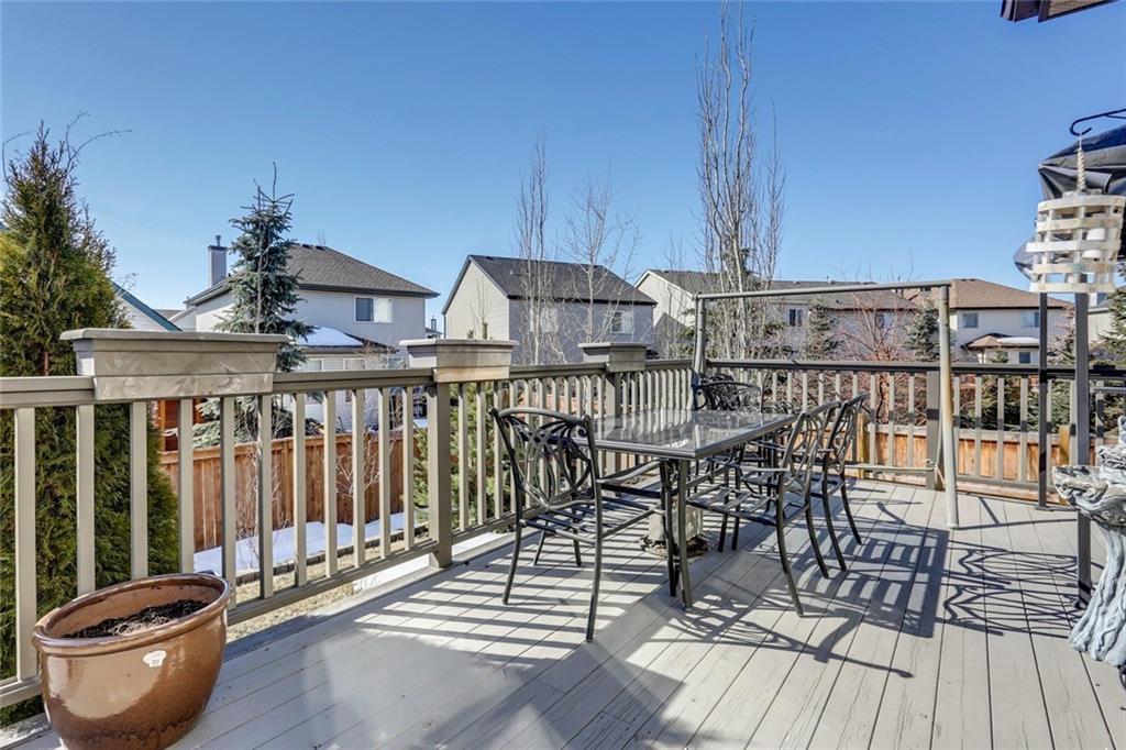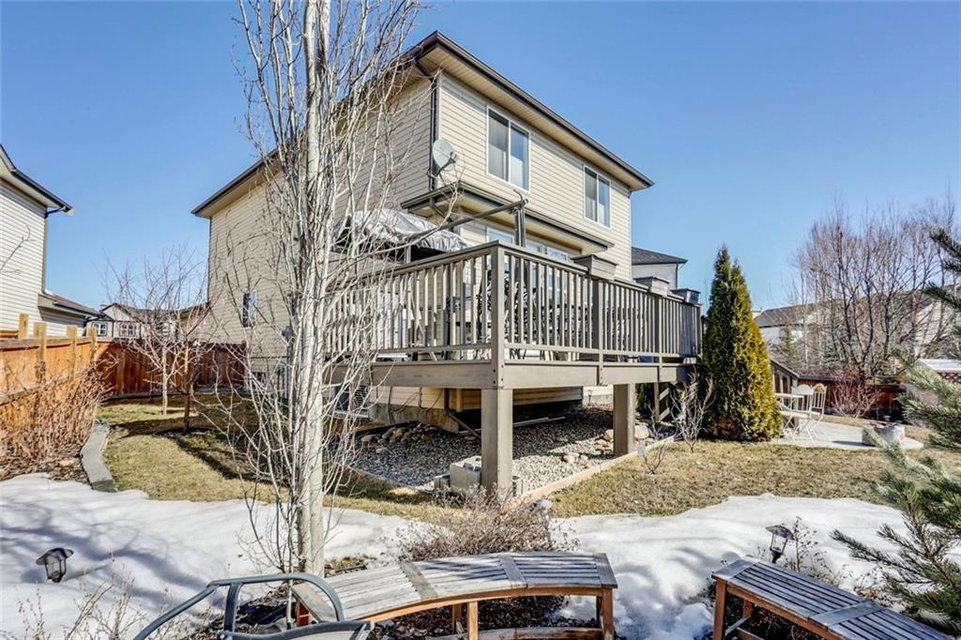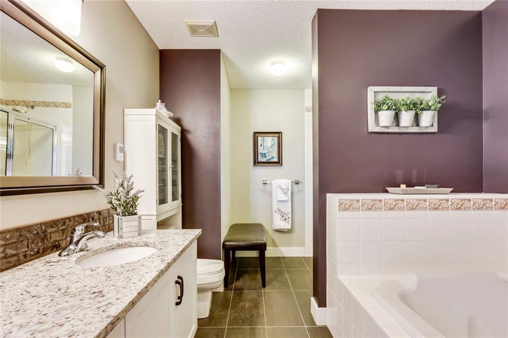 Fantastic family home in an excellent location! This large two storey home has been tastefully updated to include a beautiful open concept white kitchen with granite counter tops, large eating area, walk-in pantry, 9′ ceilings, living room w/ gas fireplace, main floor den, dark rich stressed hardwood, large south facing deck, massive pie shaped lot, beautifully landscaped with loads of trees (including fruit trees), gorgeous stamped concrete with custom fire pit, and a storage shed. The upper level boasts a very functional laundry room, three generous bedrooms – large master bath features a jetted tub, separate shower, granite counters, heated floors, walk-in closet. The fully developed lower level has two additional bedrooms (5 total) – both with large windows, a third full bathroom that also has heated floors, family room with a second gas fireplace, and storage area. Situated in a quiet cove and walking distance to schools & public transit. Shows pride of ownership, a great place to call home.