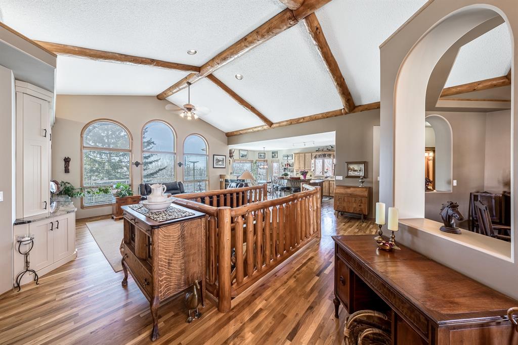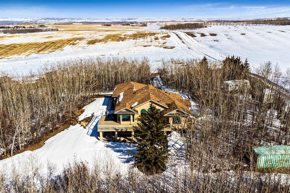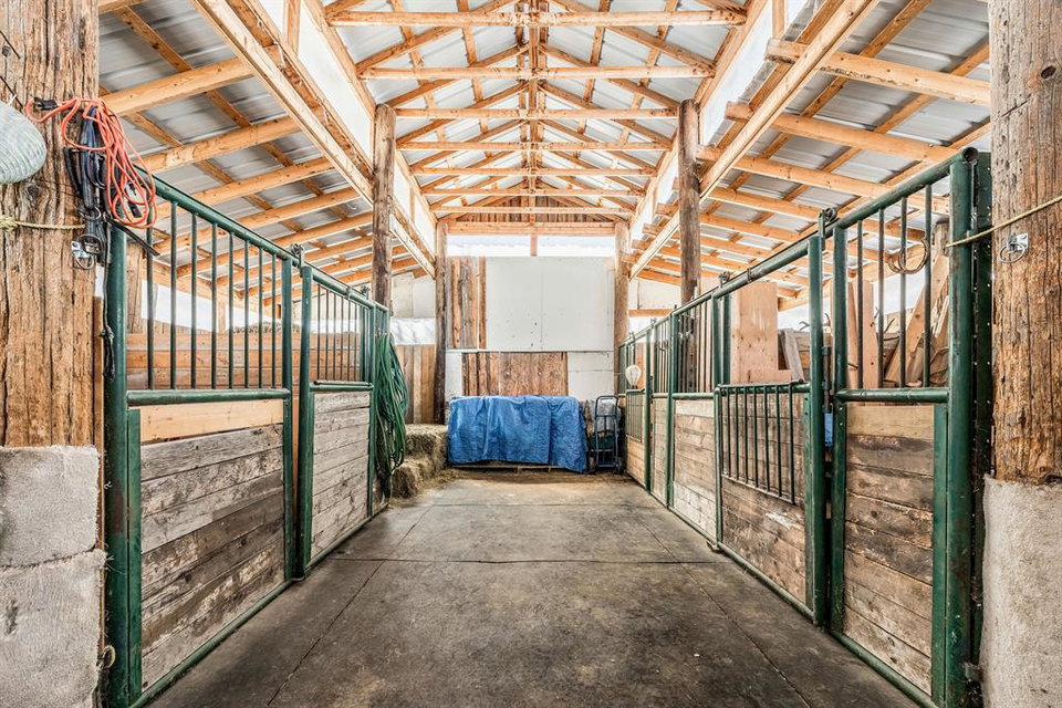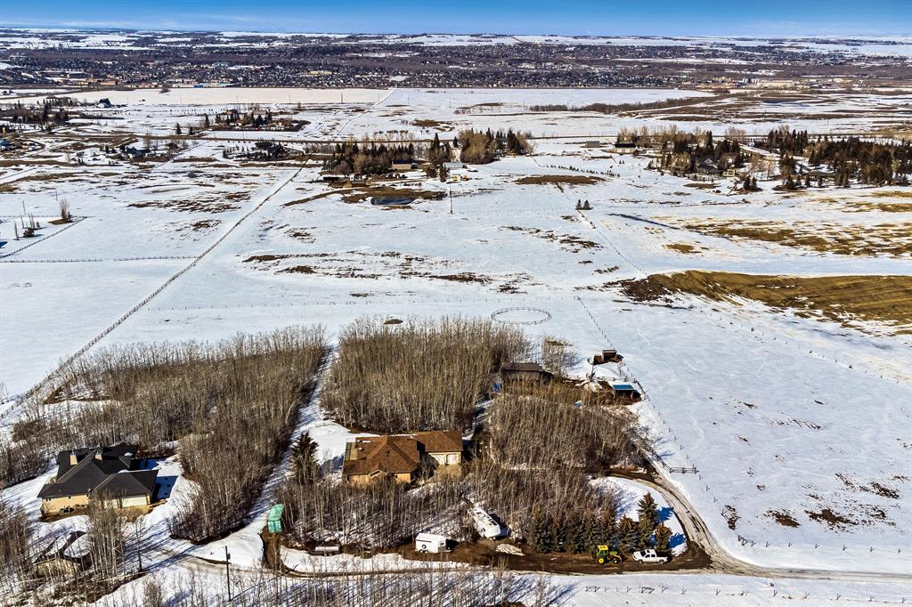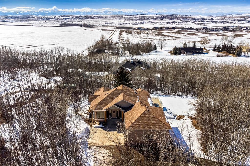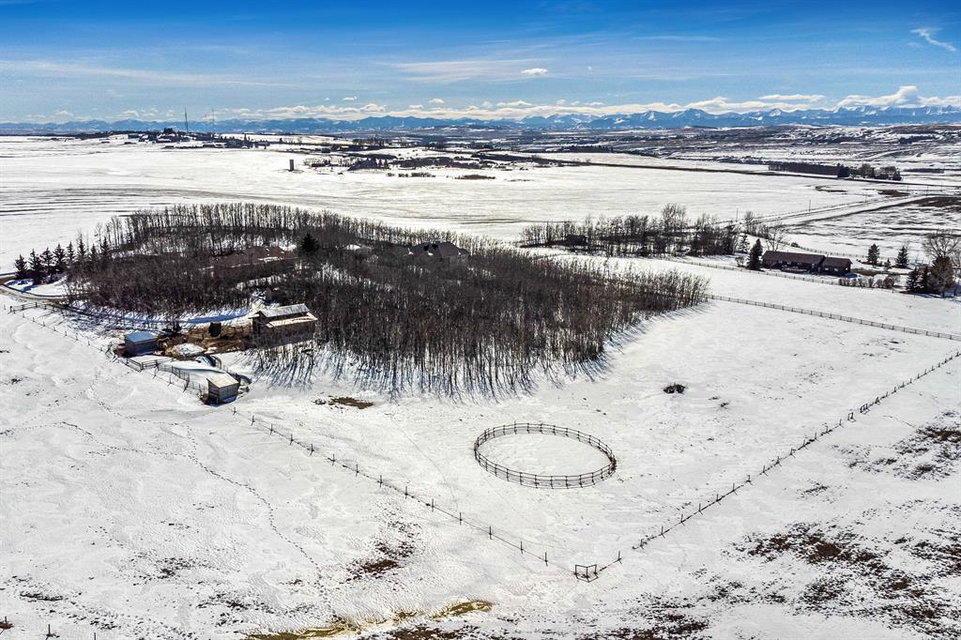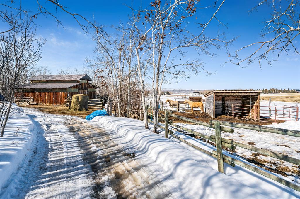 Dreaming of country life with a mountain view? This 4 acre parcel is the perfect spot to soak in all the peace and privacy of the country while being only minutes away from all the conveniences of Okotoks. This property has everything you need for a thriving hobby farm. The circle drive takes you past the two horse corrals, a round pen, 3-stall horse barn offering 900sqft of space for livestock on those cold days (includes electricity, water & rubber mat flooring). There is also an additional exterior water feeder, and 2 horse shelters. This is the perfect setup for all your equestrian needs. Kick off your boots in this gorgeous 1879sqft bungalow with an impressive 23ft soring ceilings with solid wood log beams throughout the great room. The high ceilings allow for a ton of natural light all day long. The open concept features hardwood floors, an island kitchen with granite counter tops and raised breakfast bar, walk-in pantry, gas stove, formal dining area, and large sunny nook with the gorgeous mountain views. The large 12ft wraparound dura-deck with glass railings is wonderful and ideal for entertaining or family gatherings. The office and primary bedroom both have 10ft ceilings. Primary bedroom also has views, generous closet, spa like ensuite with a double vanity. The walk-out lower level has in-floor heating to keep you warm, two more bedrooms, a third bathroom, lots of storage and even an unheated insulated wine/cold room. There is a walk up from the basement to the oversized triple garage with in-floor heating. This is such an incredible piece of land and must be seen to be truly appreciated.