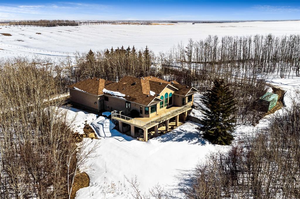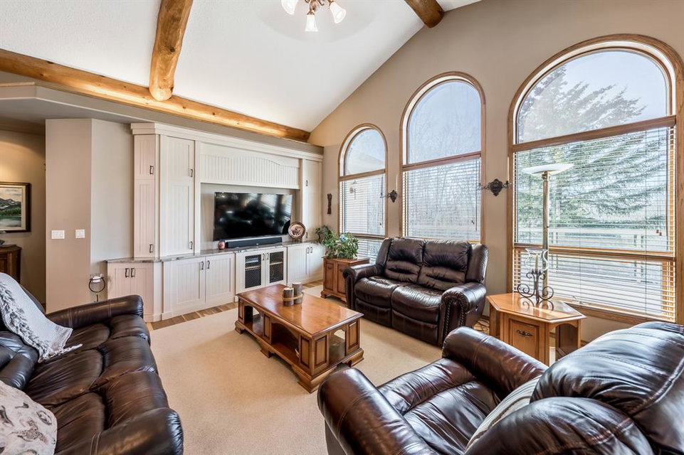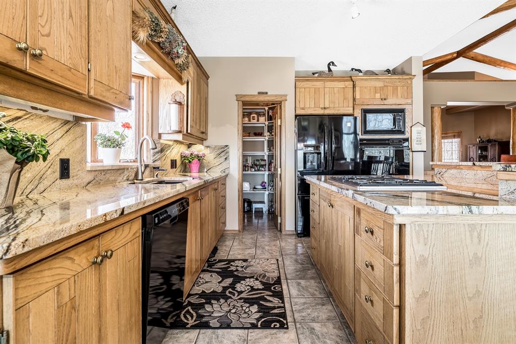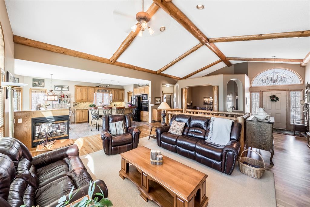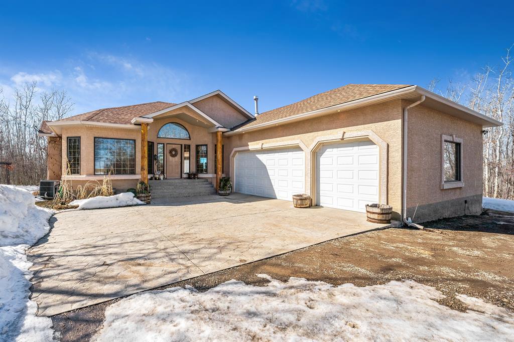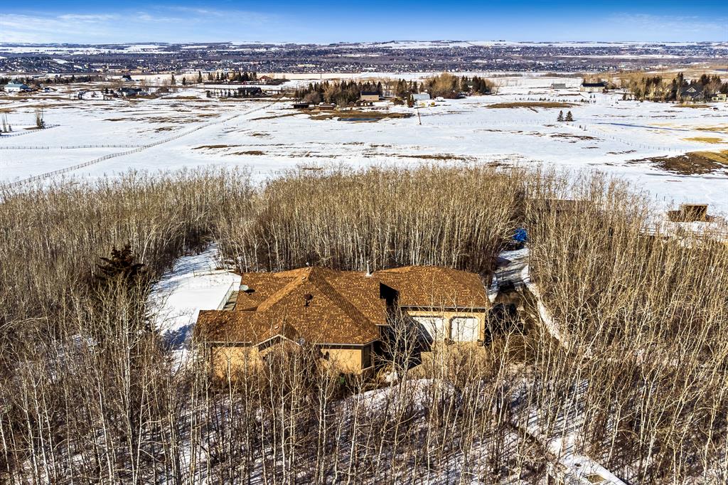 Dreaming of country life with a mountain view? This 4 acre parcel is the perfect spot to soak in all the peace and privacy of the country while being only minutes away from all the conveniences of Okotoks. This property has everything you need for a thriving hobby farm. The circle drive takes you past the two horse corrals, a round pen, 3-stall horse barn offering 900sqft of space for livestock on those cold days (includes electricity, water & rubber mat flooring). There is also an additional exterior water feeder, and 2 horse shelters. This is the perfect setup for all your equestrian needs. Kick off your boots in this gorgeous 1879sqft bungalow with an impressive 23ft soring ceilings with solid wood log beams throughout the great room. The high ceilings allow for a ton of natural light all day long. The open concept features hardwood floors, an island kitchen with granite counter tops and raised breakfast bar, walk-in pantry, gas stove, formal dining area, and large sunny nook with the gorgeous mountain views. The large 12ft wraparound dura-deck with glass railings is wonderful and ideal for entertaining or family gatherings. The office and primary bedroom both have 10ft ceilings. Primary bedroom also has views, generous closet, spa like ensuite with a double vanity. The walk-out lower level has in-floor heating to keep you warm, two more bedrooms, a third bathroom, lots of storage and even an unheated insulated wine/cold room. There is a walk up from the basement to the oversized triple garage with in-floor heating. This is such an incredible piece of land and must be seen to be truly appreciated.