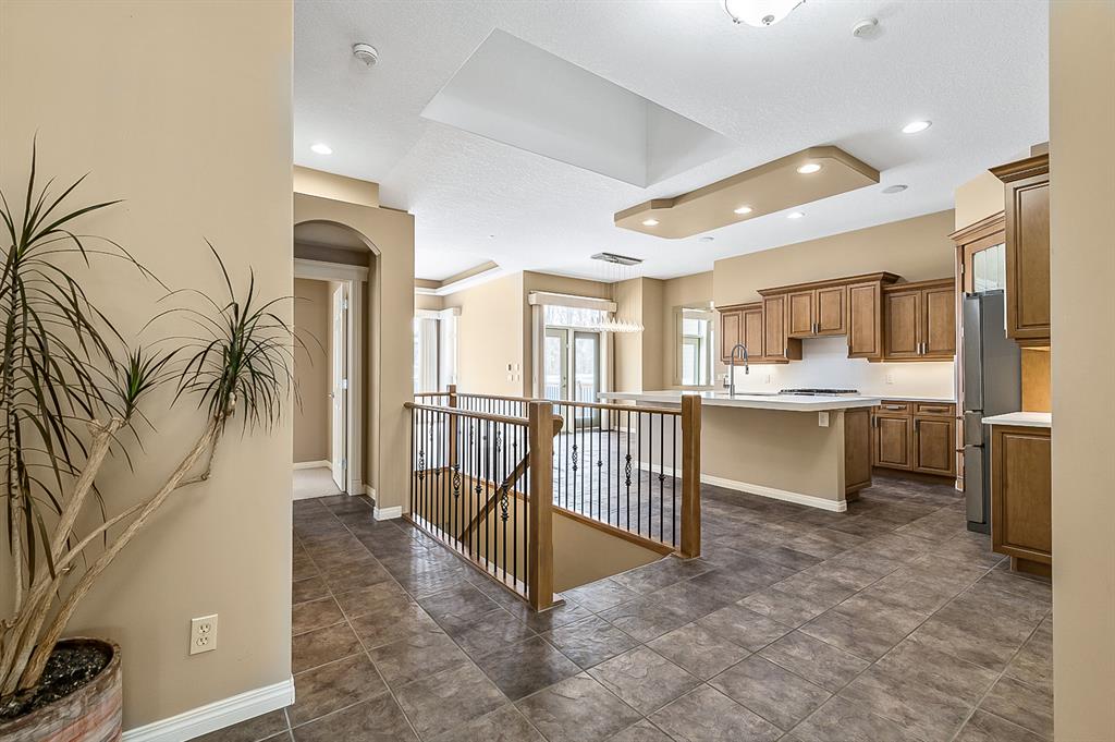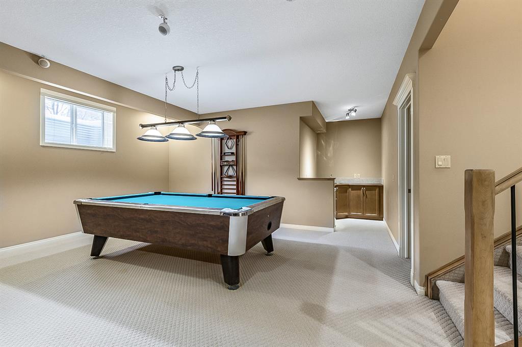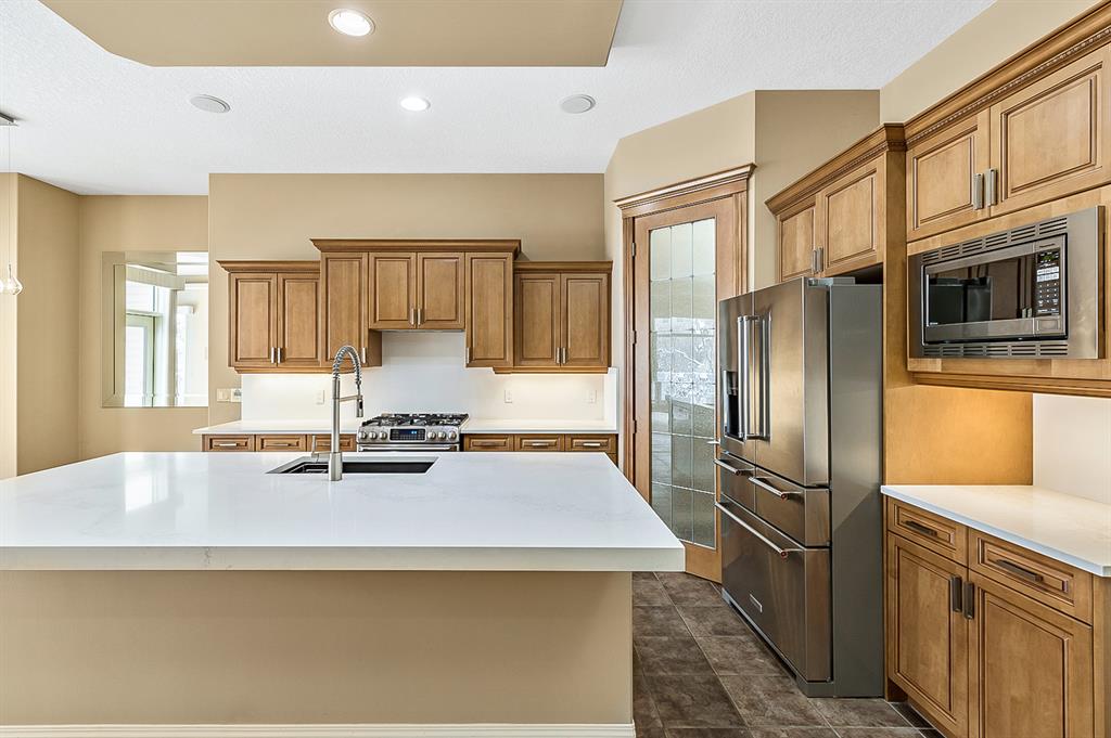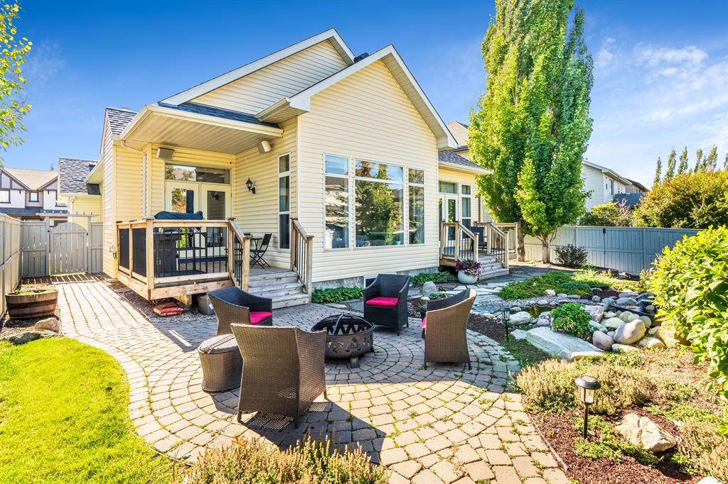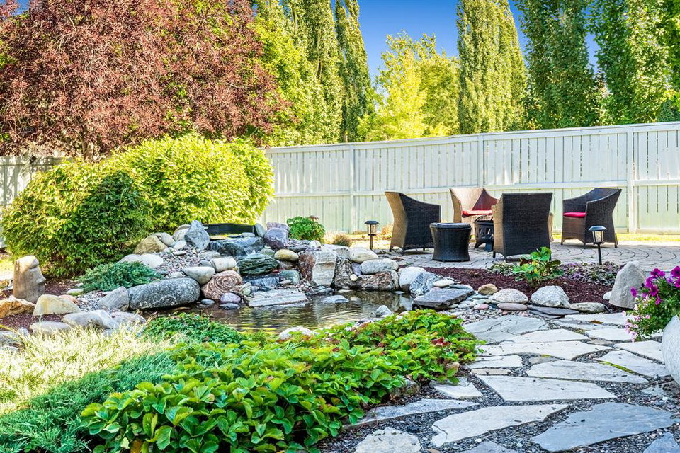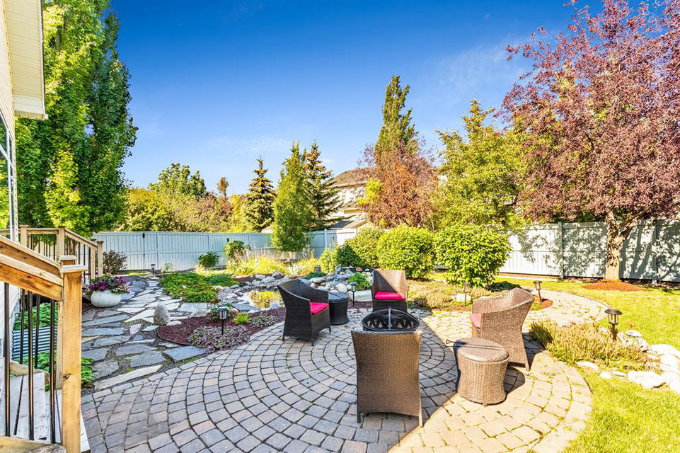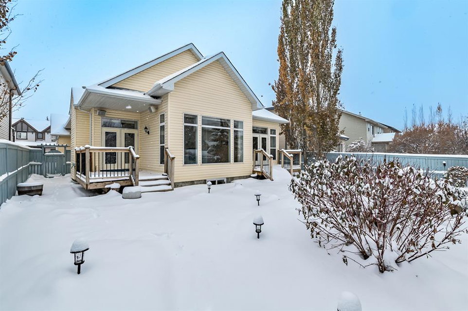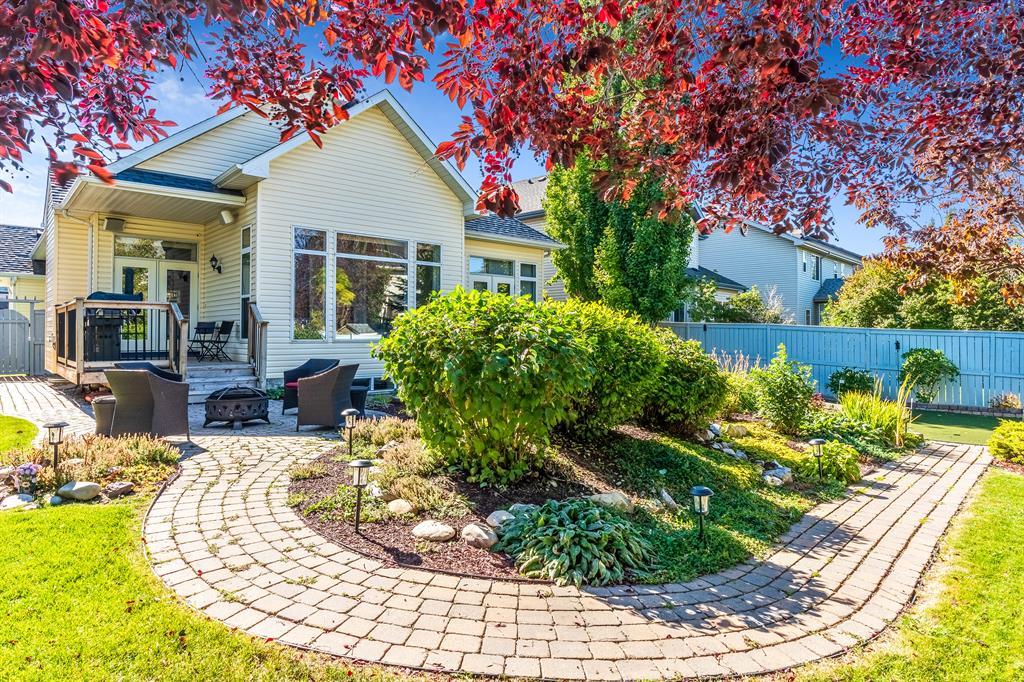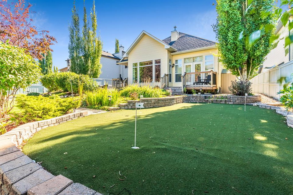 Stunning Albi built Estate Bungalow in a quiet cul-de-sac! This home shows pride of ownership with upgrades. The tile entry & hall leads to the gourmet kitchen featuring an open floor plan, 8ft stone island, maple glazed mocha cabinets, granite under mount sink, gas stove – upgraded appliances, walk-thru pantry to mudroom/laundry. A big skylight allows for a ton of natural light, newly faced Vermont gas fireplace. Huge primary bedroom on main, spa ensuite, dual sinks, granite counter tops, built-in speakers, ceiling fan, jetted tub with separate shower, generous walk-in closet, second door to deck off master. A large office/den at the front of the home, ideal for working at home completes this level. Lower level developed with Moka glaze built in media centre, games room area large enough for pool table and bar, two additional good size bedrooms, 4pc bath, 9 ft ceilings, cedar lined closet, hobby room/workshop and an exercise room with rubber floor. This home has central air conditioning and a new roof in 2017. The mature landscaped yard with Rainbird irrigation is completely fenced, a water feature and beautiful perennials. There is also a putting green for the golfer in the family. Excellent location and only minutes to the pond & pathways. This home shows great!