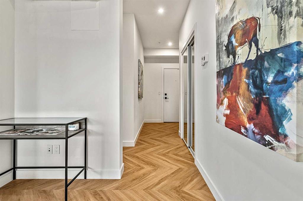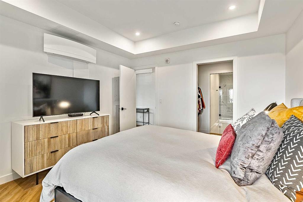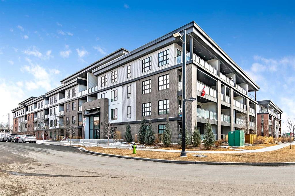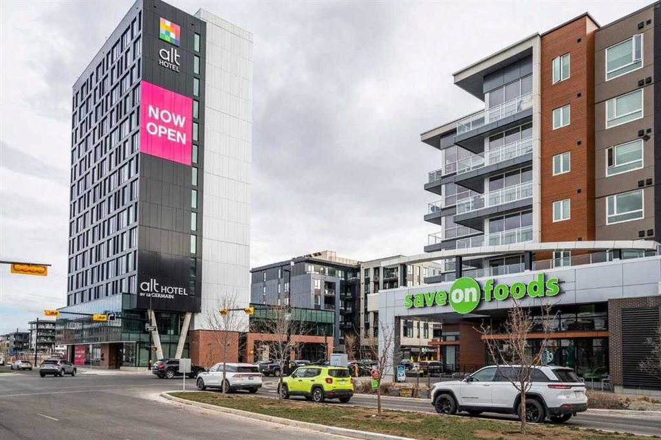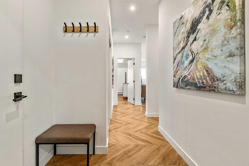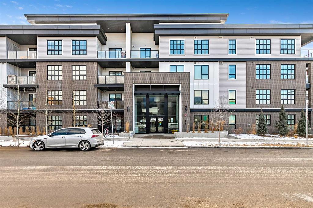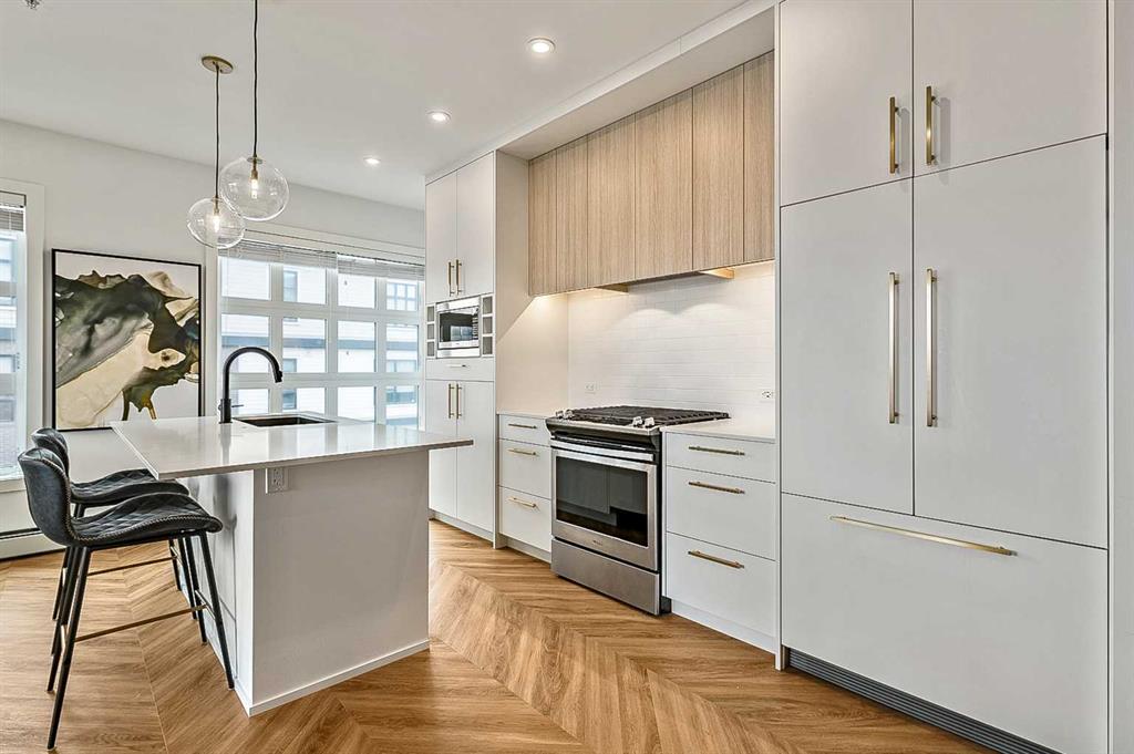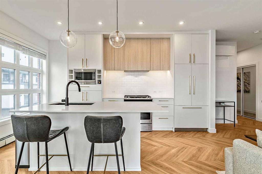 Welcome to this stunning corner unit condominium in the vibrant University District, where luxury meets contemporary living. This exceptional two-bedroom, two-bathroom residence showcases sophisticated design elements throughout, beginning with elegant herringbone vinyl flooring and soaring 9-foot ceilings that create an impressive sense of space. The open-concept living area flows seamlessly, illuminated by abundant natural light streaming through large windows. A highlight of this home is the generously sized covered balcony, complete with a gas line for year-round outdoor entertaining. The gourmet kitchen stands as a testament to modern design, featuring built-in paneled appliances, including a refrigerator and dishwasher, alongside a premium gas-stove. Beautiful brass hardware add refined touches to this culinary space. The primary bedroom suite offers a spa-like retreat with its custom walk-in closet and luxurious ensuite bathroom, featuring dual vanities and a glass-enclosed shower. The spacious second bedroom is also equally well-appointed. Full air conditioning throughout with three separate units – one in each bedroom and an additional third A/C unit in the main living space ensures year-round comfort. Building amenities enhance the living experience with a third-floor fitness center, bike storage and repair facilities, pet wash station, and dedicated storage space across the hall. TWO SIDE BY SIDE TITLED UNDERGROUND PARKING stalls and front desk security provide peace of mind. Located in a thriving, walkable community, residents enjoy easy access to boutique shopping, dining, entertainment, and outdoor recreation. The proximity to the University of Calgary, hospitals, and major transit routes makes this location ideal for those seeking a connected urban lifestyle.