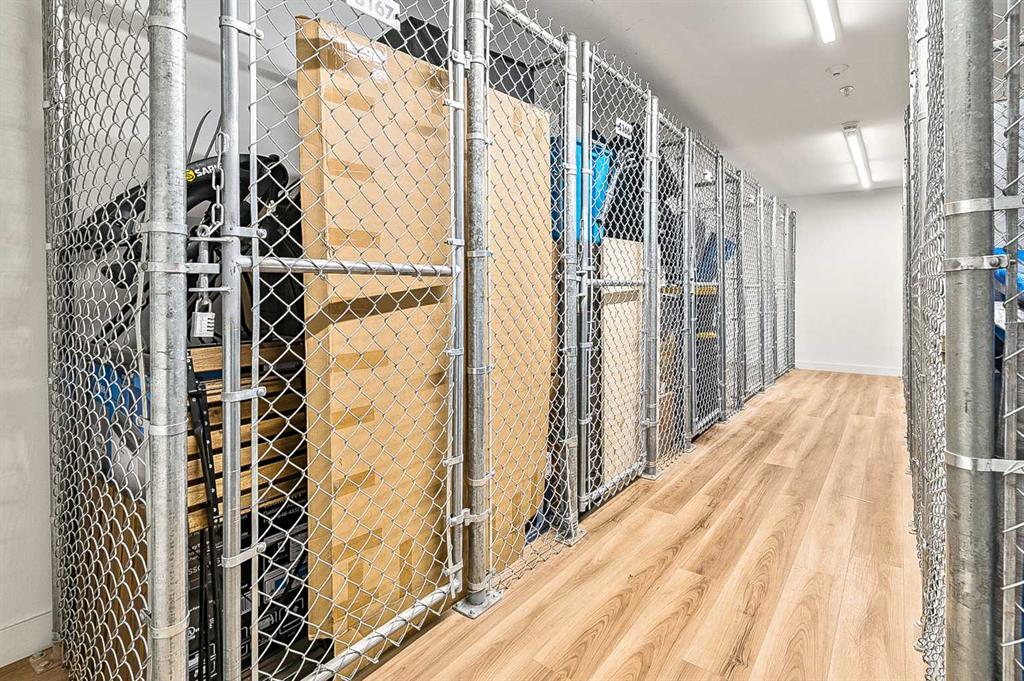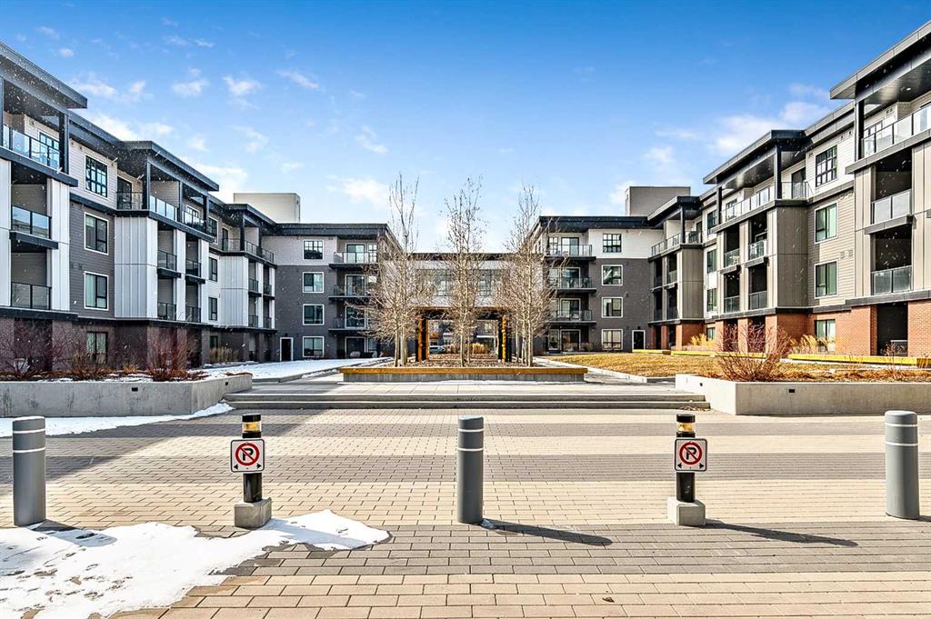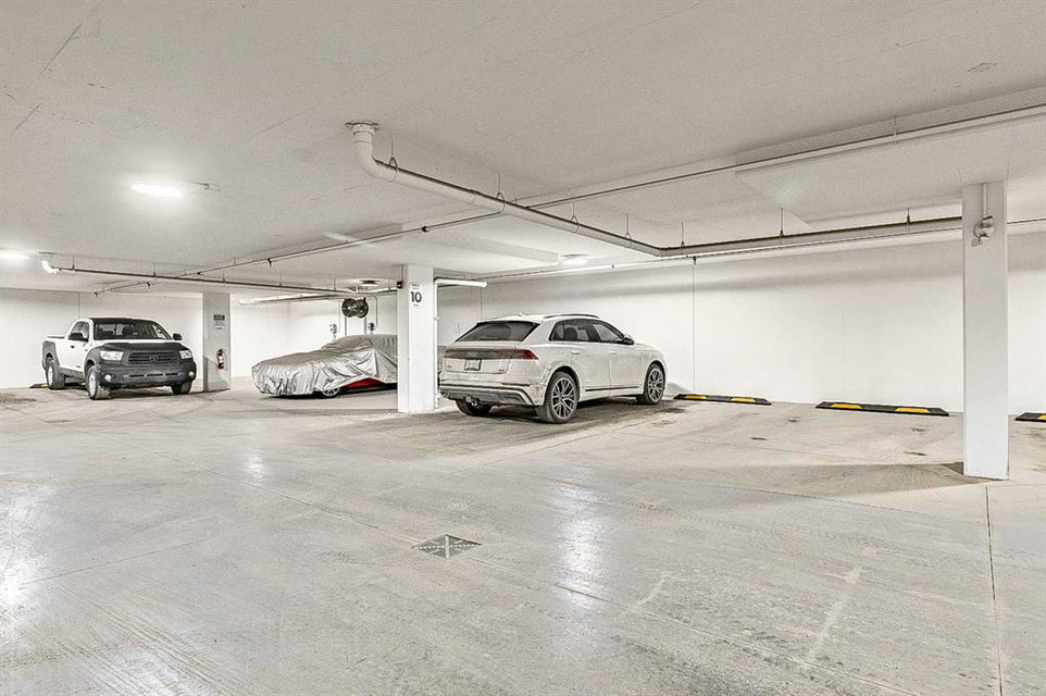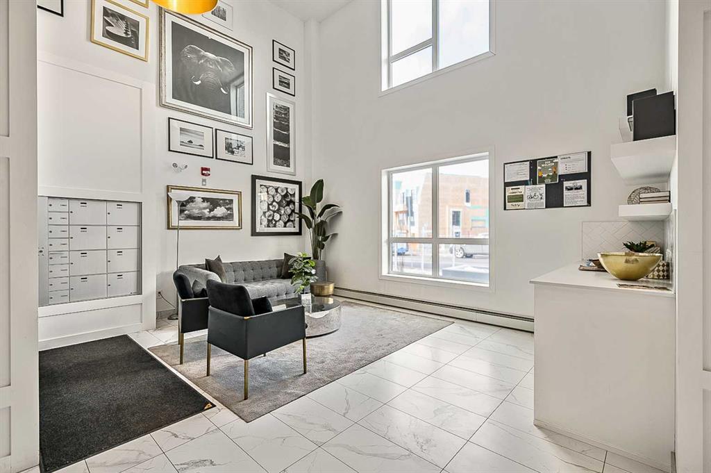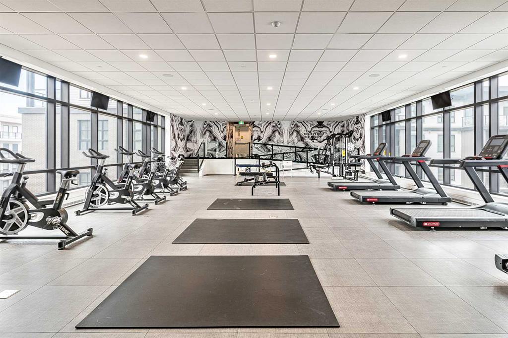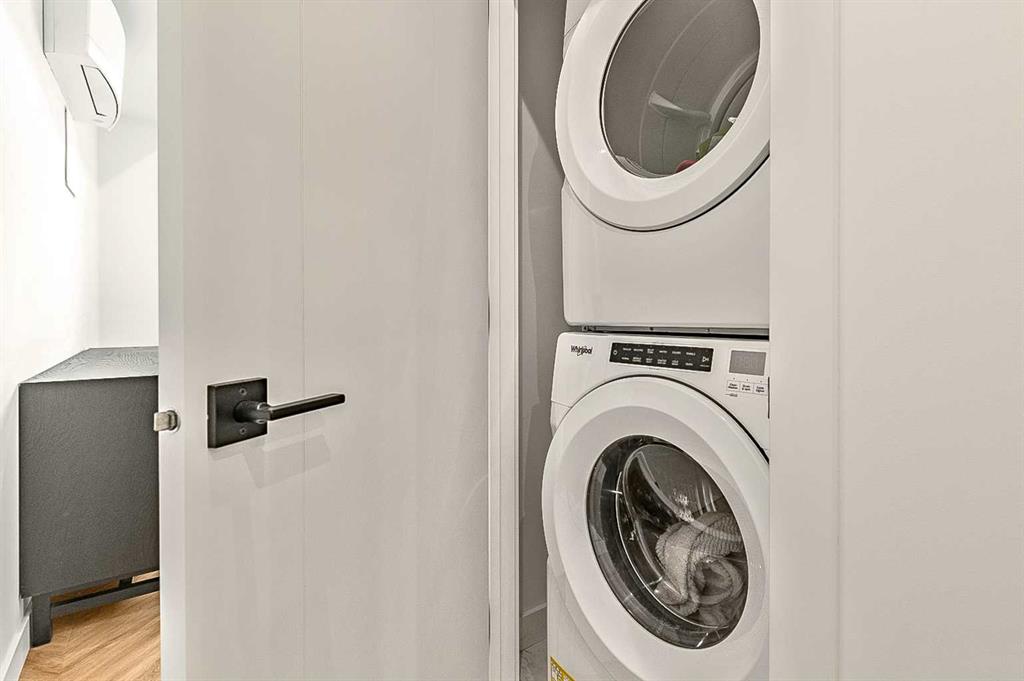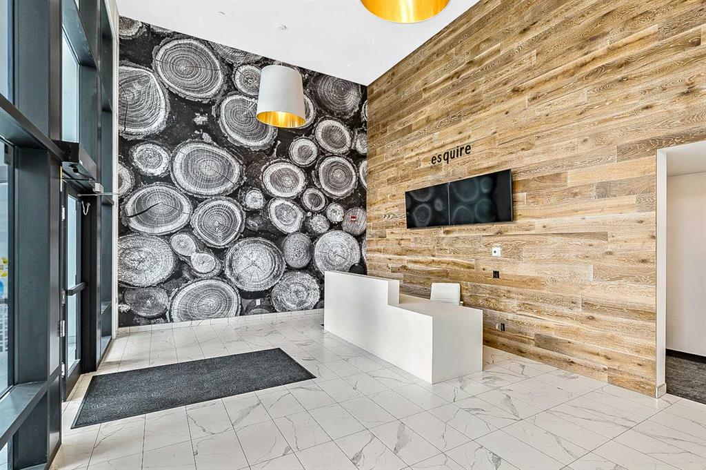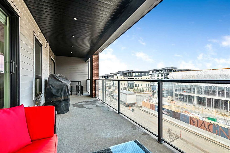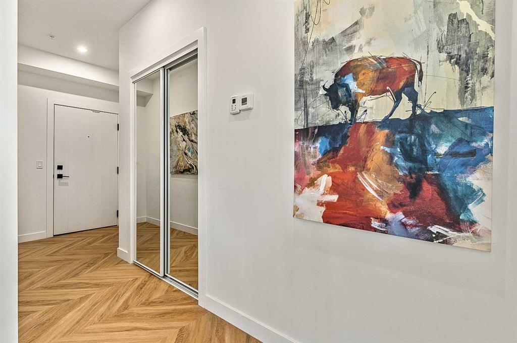 Welcome to this stunning corner unit condominium in the vibrant University District, where luxury meets contemporary living. This exceptional two-bedroom, two-bathroom residence showcases sophisticated design elements throughout, beginning with elegant herringbone vinyl flooring and soaring 9-foot ceilings that create an impressive sense of space. The open-concept living area flows seamlessly, illuminated by abundant natural light streaming through large windows. A highlight of this home is the generously sized covered balcony, complete with a gas line for year-round outdoor entertaining. The gourmet kitchen stands as a testament to modern design, featuring built-in paneled appliances, including a refrigerator and dishwasher, alongside a premium gas-stove. Beautiful brass hardware add refined touches to this culinary space. The primary bedroom suite offers a spa-like retreat with its custom walk-in closet and luxurious ensuite bathroom, featuring dual vanities and a glass-enclosed shower. The spacious second bedroom is also equally well-appointed. Full air conditioning throughout with three separate units – one in each bedroom and an additional third A/C unit in the main living space ensures year-round comfort. Building amenities enhance the living experience with a third-floor fitness center, bike storage and repair facilities, pet wash station, and dedicated storage space across the hall. TWO SIDE BY SIDE TITLED UNDERGROUND PARKING stalls and front desk security provide peace of mind. Located in a thriving, walkable community, residents enjoy easy access to boutique shopping, dining, entertainment, and outdoor recreation. The proximity to the University of Calgary, hospitals, and major transit routes makes this location ideal for those seeking a connected urban lifestyle.