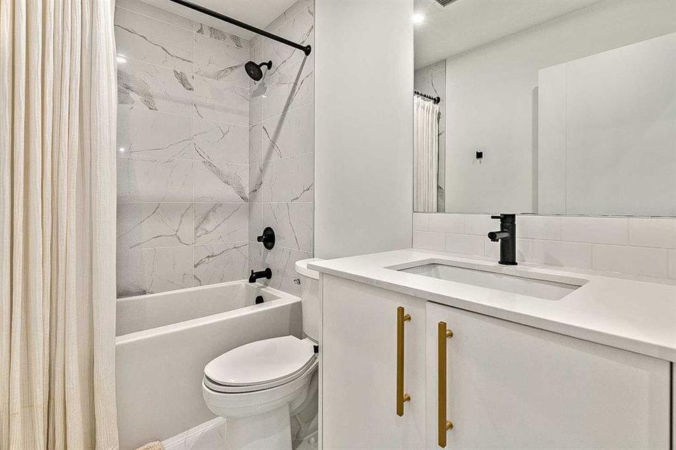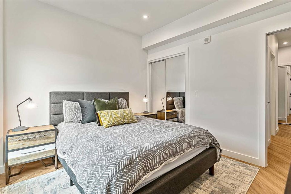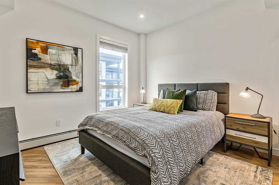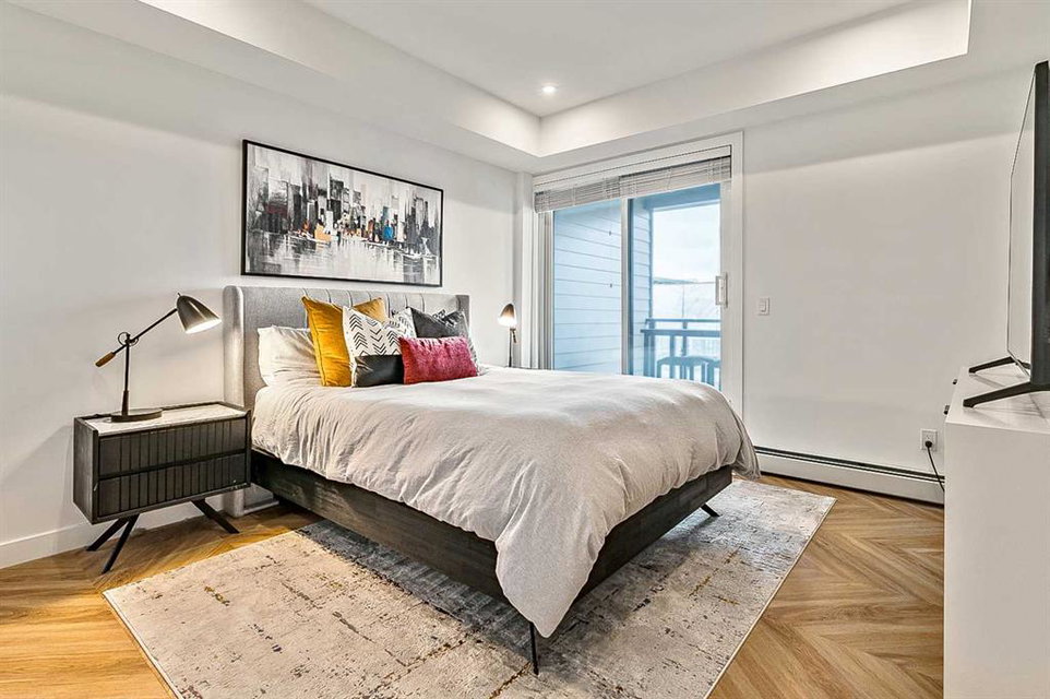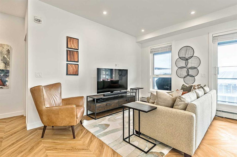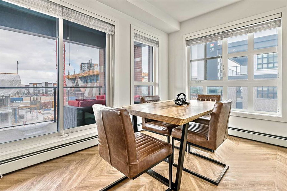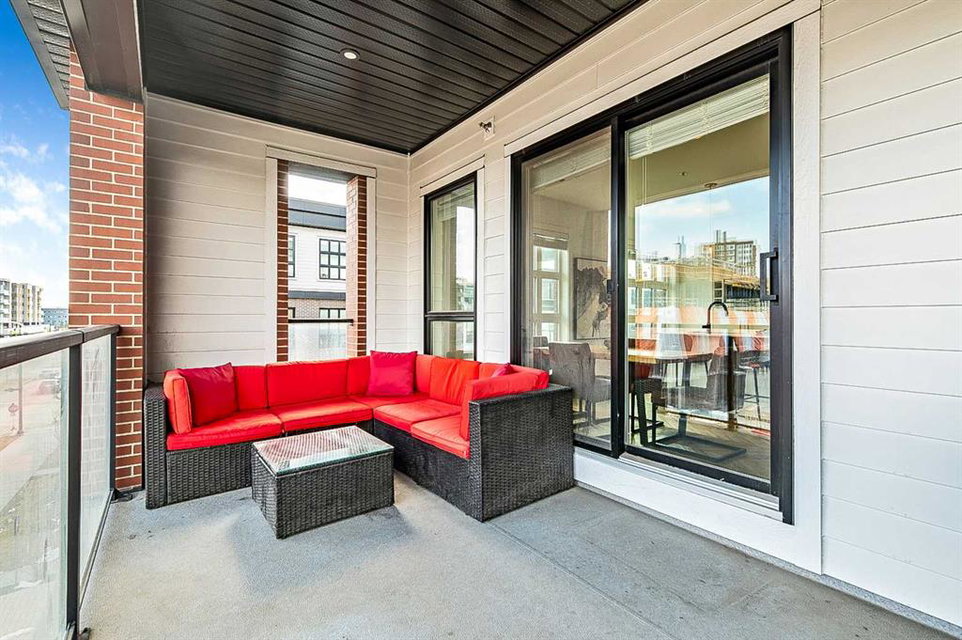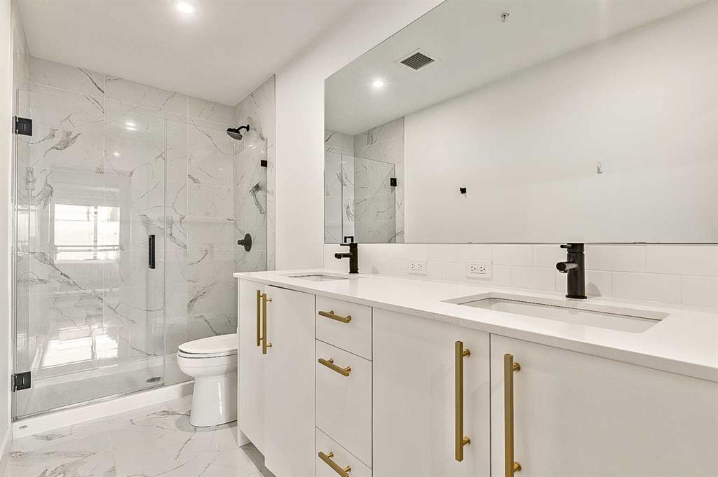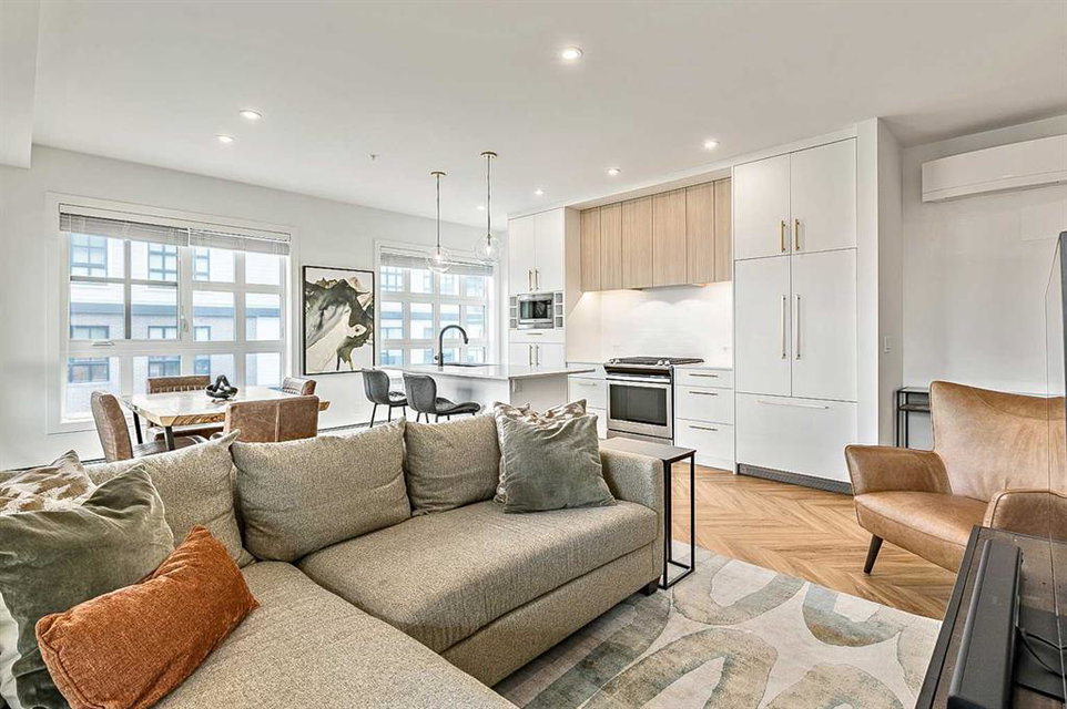Welcome to this stunning corner unit condominium in the vibrant University District, where luxury meets contemporary living. This exceptional two-bedroom, two-bathroom residence showcases sophisticated design elements throughout, beginning with elegant herringbone vinyl flooring and soaring 9-foot ceilings that create an impressive sense of space. The open-concept living area flows seamlessly, illuminated by abundant natural light streaming through large windows. A highlight of this home is the generously sized covered balcony, complete with a gas line for year-round outdoor entertaining. The gourmet kitchen stands as a testament to modern design, featuring built-in paneled appliances, including a refrigerator and dishwasher, alongside a premium gas-stove. Beautiful brass hardware add refined touches to this culinary space. The primary bedroom suite offers a spa-like retreat with its custom walk-in closet and luxurious ensuite bathroom, featuring dual vanities and a glass-enclosed shower. The spacious second bedroom is also equally well-appointed. Full air conditioning throughout with three separate units – one in each bedroom and an additional third A/C unit in the main living space ensures year-round comfort. Building amenities enhance the living experience with a third-floor fitness center, bike storage and repair facilities, pet wash station, and dedicated storage space across the hall. TWO SIDE BY SIDE TITLED UNDERGROUND PARKING stalls and front desk security provide peace of mind. Located in a thriving, walkable community, residents enjoy easy access to boutique shopping, dining, entertainment, and outdoor recreation. The proximity to the University of Calgary, hospitals, and major transit routes makes this location ideal for those seeking a connected urban lifestyle.