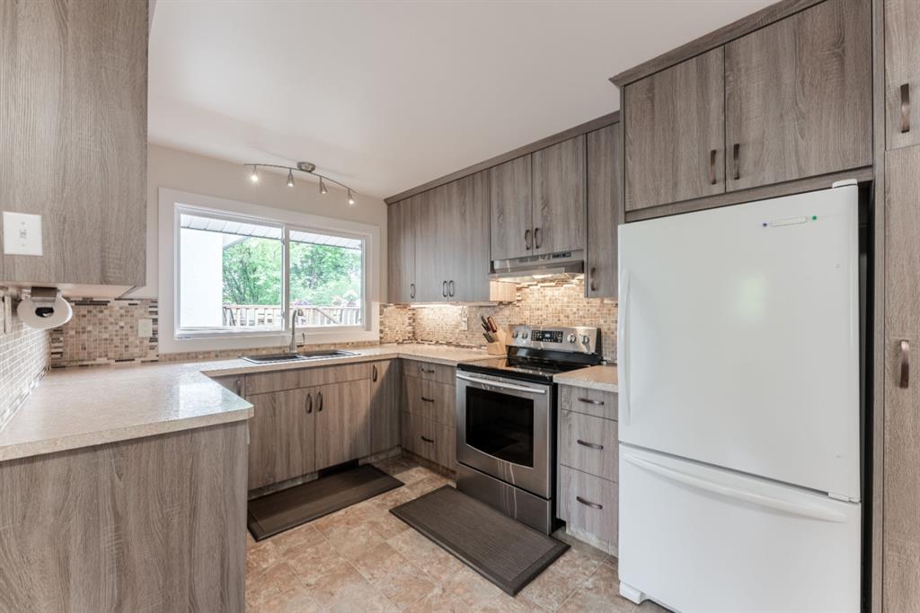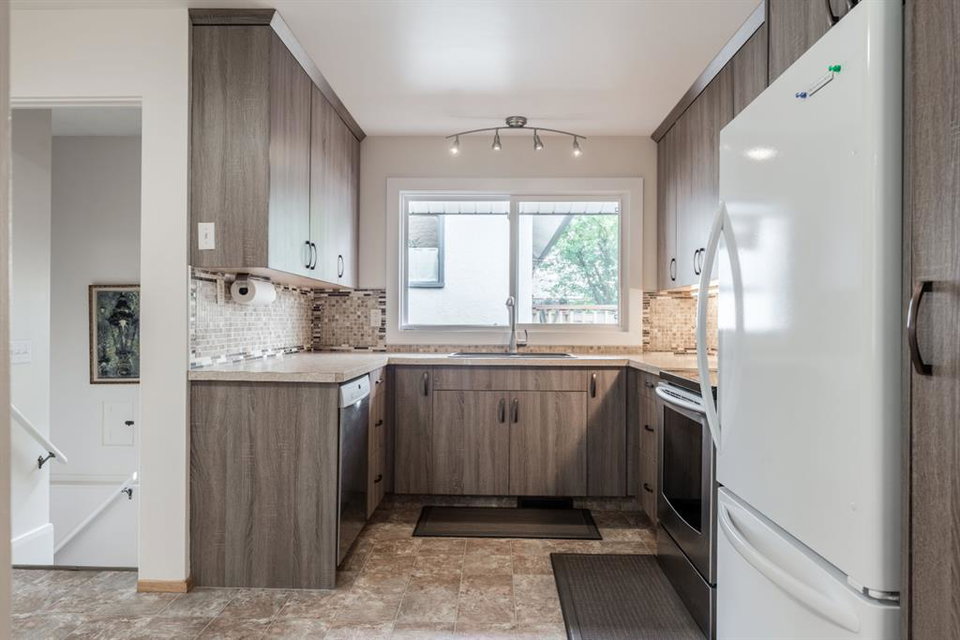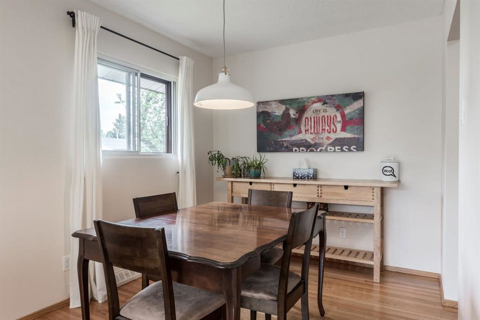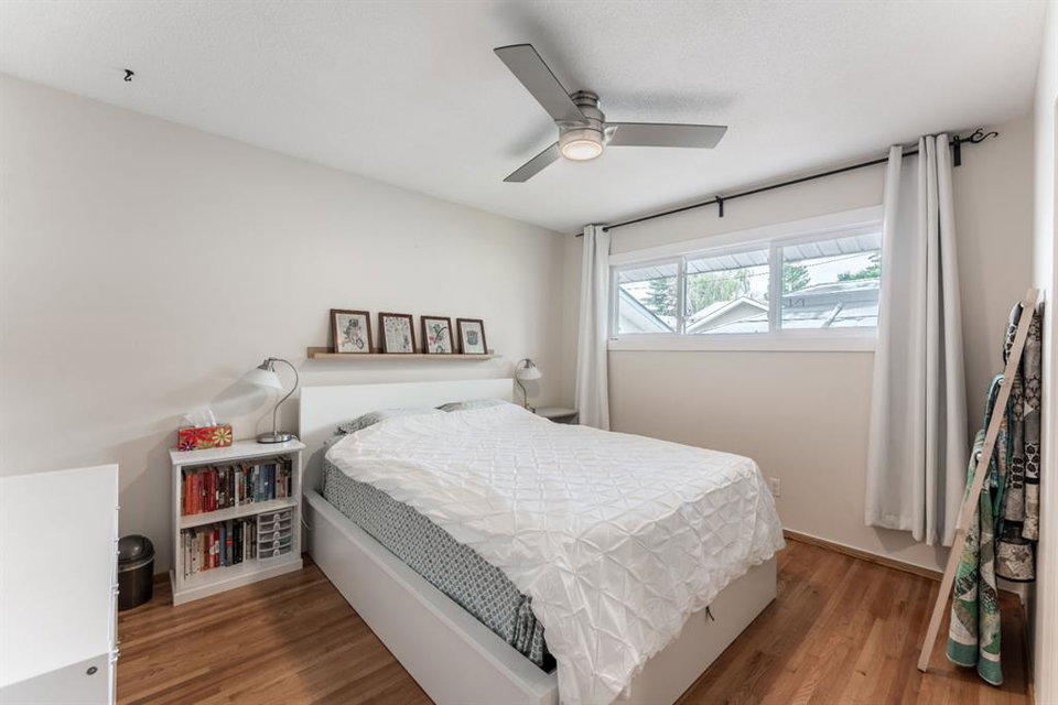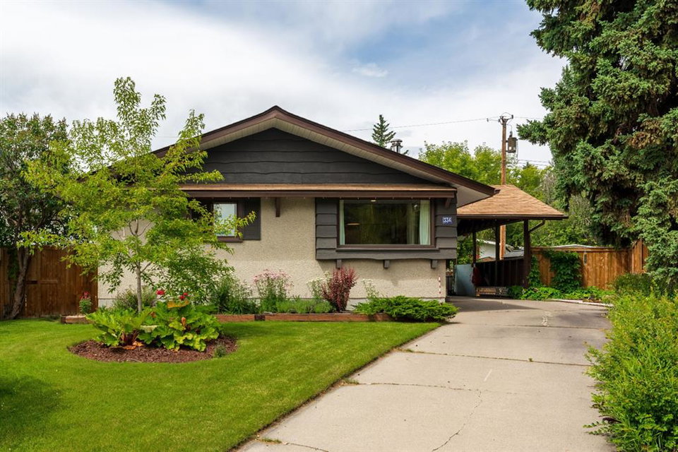 Beautiful updated bungalow with quiet location on a pie-shaped lot! Main floor features gleaming oak hardwood floors, large living with oversized windows, open concept floor plan, kitchen enjoys newer cabinets & appliances with modern backsplash and breakfast nook. Three generous sized bedrooms perfect for a growing family and updated 5pc bath. Fully finished basement includes extra bedroom with permitted egress window, brand new 3pc bath, huge family/rec. room with wood burning fireplace & wet bar. Spacious storage room with laundry hook-ups complete this level. Recent upgrades include high efficient furnace (2017), vinyl windows in kitchen & bedrooms (2017), interior & exterior paint, updated electrical and newer steel front door with phantom screen. Large sunny west backyard is fully fenced and features brick patio, garden, kids sand box, mature apple tree, new pear tree and fire-pit. The long driveway provides extra parking & carport. Walking distance to schools, public transit, shopping and easy access to all major roadways. Home is a pleasure to show!!