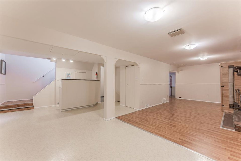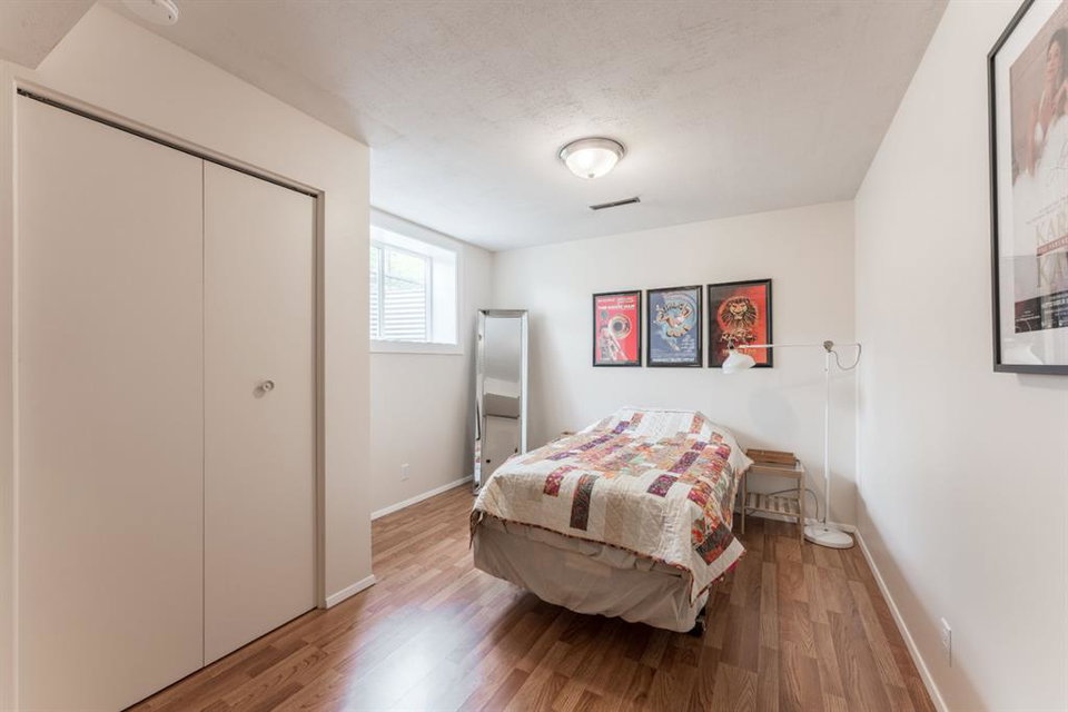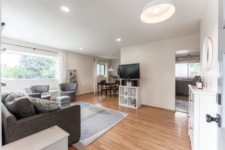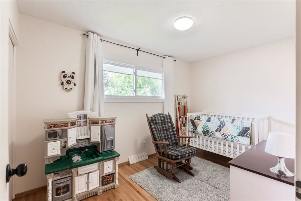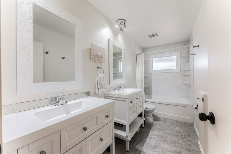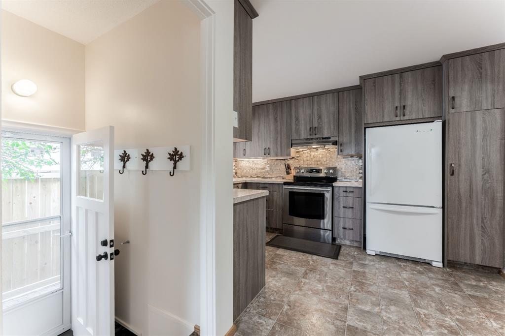 Beautiful updated bungalow with quiet location on a pie-shaped lot! Main floor features gleaming oak hardwood floors, large living with oversized windows, open concept floor plan, kitchen enjoys newer cabinets & appliances with modern backsplash and breakfast nook. Three generous sized bedrooms perfect for a growing family and updated 5pc bath. Fully finished basement includes extra bedroom with permitted egress window, brand new 3pc bath, huge family/rec. room with wood burning fireplace & wet bar. Spacious storage room with laundry hook-ups complete this level. Recent upgrades include high efficient furnace (2017), vinyl windows in kitchen & bedrooms (2017), interior & exterior paint, updated electrical and newer steel front door with phantom screen. Large sunny west backyard is fully fenced and features brick patio, garden, kids sand box, mature apple tree, new pear tree and fire-pit. The long driveway provides extra parking & carport. Walking distance to schools, public transit, shopping and easy access to all major roadways. Home is a pleasure to show!!
