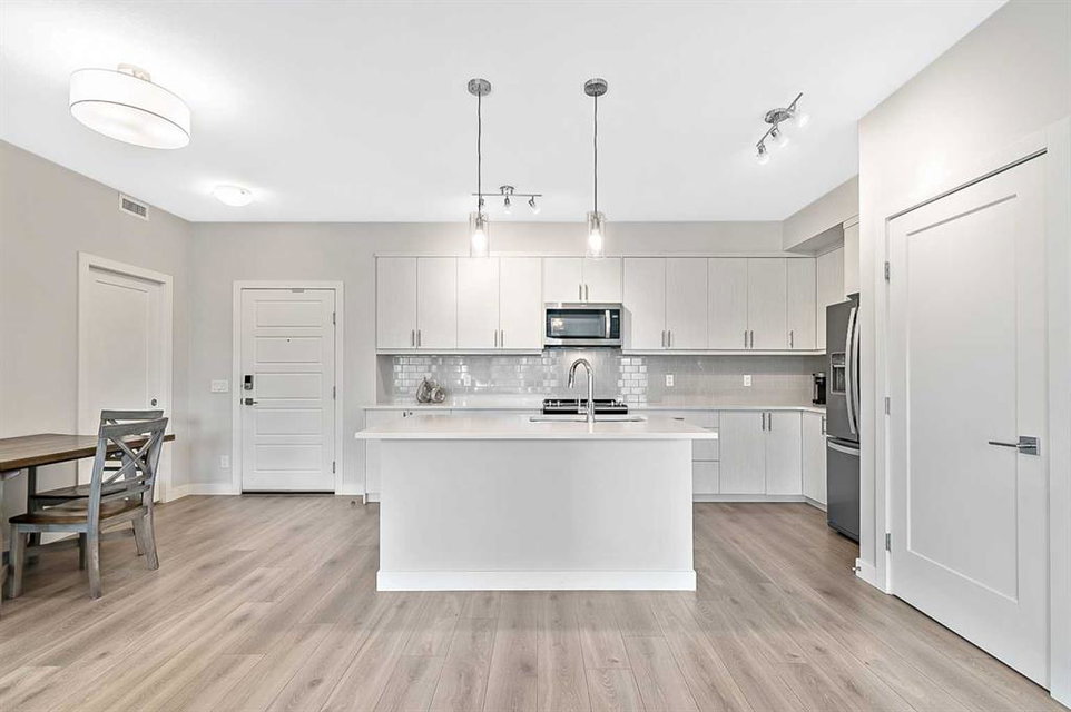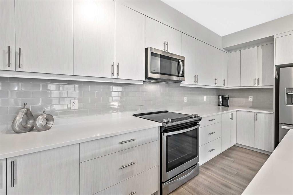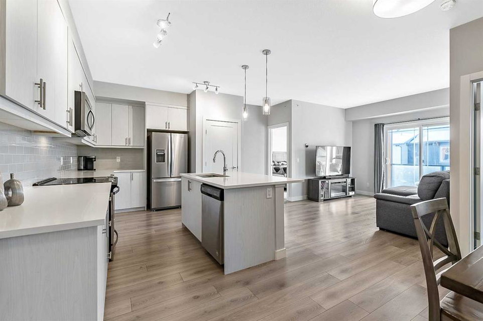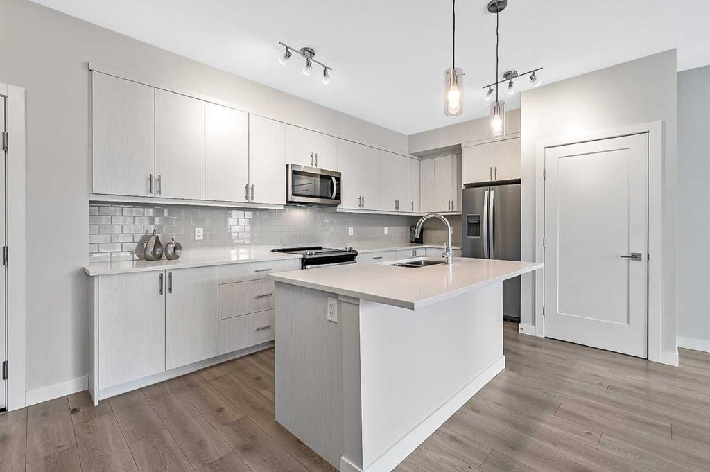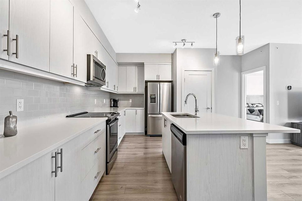 Discover luxury living in this exceptional top-floor corner unit showcasing breathtaking Rocky Mountain vistas and downtown views. The thoughtfully designed open-concept layout creates an inviting atmosphere perfect for both entertaining and everyday living. The heart of this home features a gourmet kitchen with premium finishes, including elegant quartz countertops, stylish backsplash, and a generous island that serves as an ideal gathering spot. This pristine residence offers two well-appointed bedrooms, including a primary bedroom with an ensuite bathroom and walk-in closet. The second full bathroom and in-unit laundry add convenience to daily living. Step out onto your private balcony to enjoy stunning panoramic mountain views – an ideal setting for morning coffee or evening relaxation. This modern condo maintains its like-new appeal with fresh paint throughout. Practical amenities include titled underground parking and dedicated storage space. The pet-friendly community provides exclusive lake access, creating a true resort-style living experience. The location offers the perfect balance of tranquility and convenience, with easy access to major transportation routes. Residents enjoy proximity to shopping, dining, and all the benefits of lake community living. This first-time-offered property presents a rare opportunity to own a slice of modern luxury with unmatched mountain views. Experience the pinnacle of contemporary condo living – schedule your private viewing today.