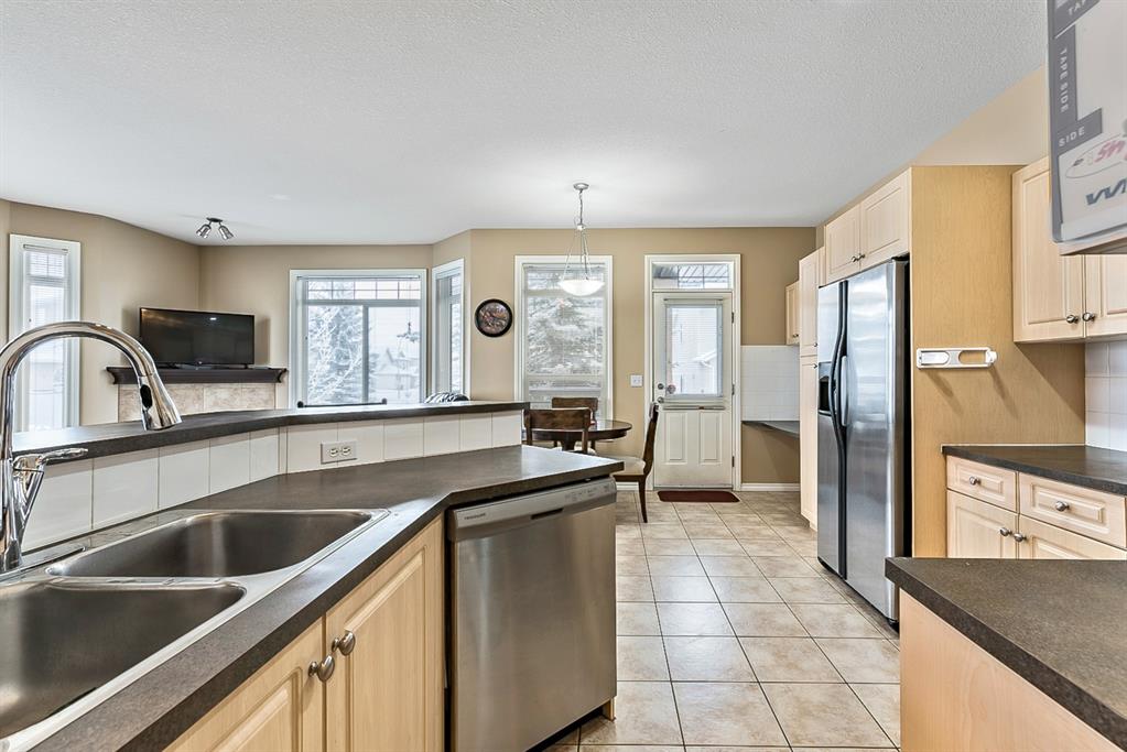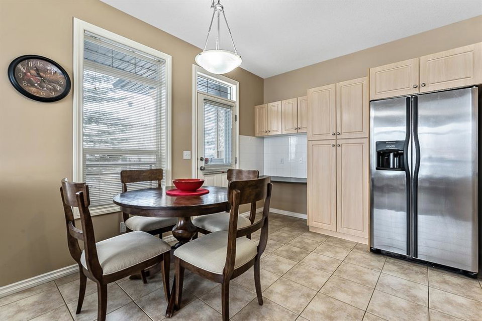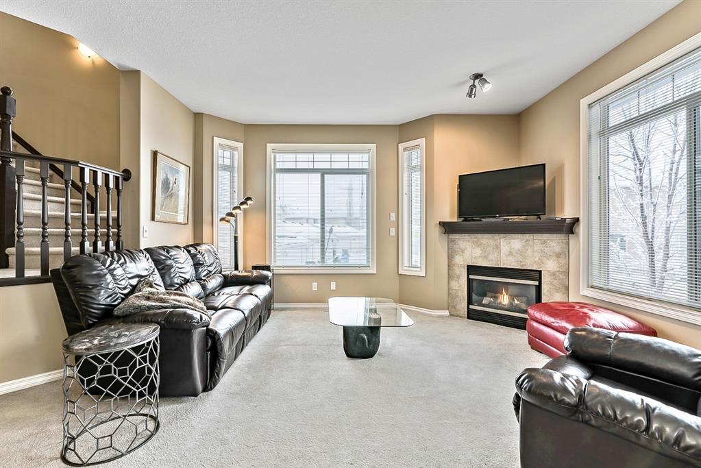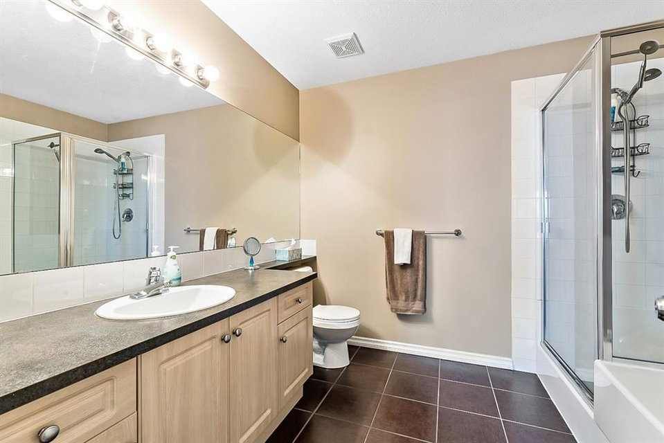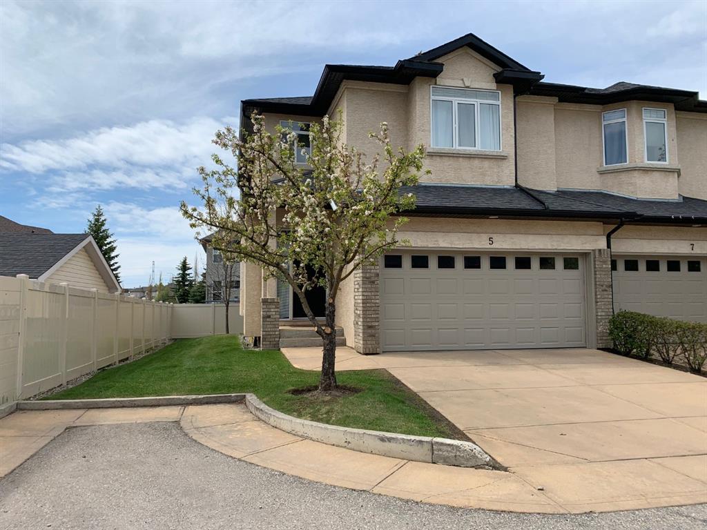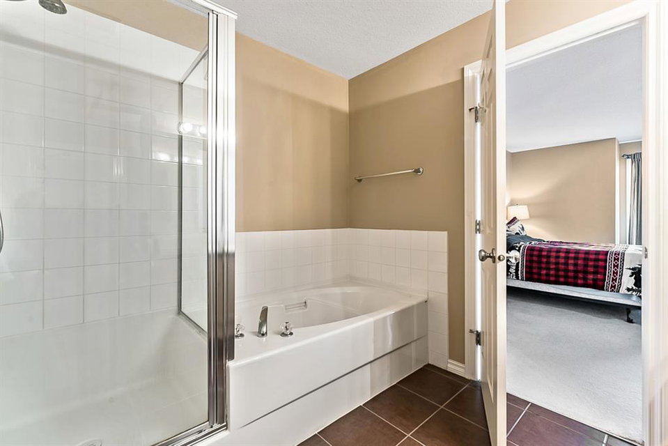 Beautiful END unit located in West Springs with sunny south exposure! This three-bedroom townhouse offers over 2100 sqft of living space with a double attached garage and a fully finished basement. Main floor features large entry way, open concept kitchen, breakfast bar island, stainless steel appliances, dining area, powder room and huge living room that enjoys gas burning fireplace. Three generous sized bedrooms on the upper floor with work-station area and 4pc bath. Master bedroom is massive with a 4pc ensuite that boasts a jetted tub, separate shower, heated tile floors and huge walk-in closet. This home is conveniently located close to abundant green spaces, schools, shopping, public transit, trendy restaurants, quick access to downtown and all major routes. Quick possession is available, if needed. Home shows extremely well with pride of ownership!