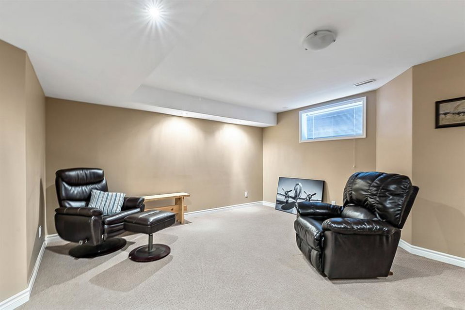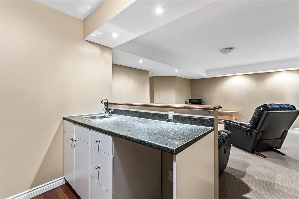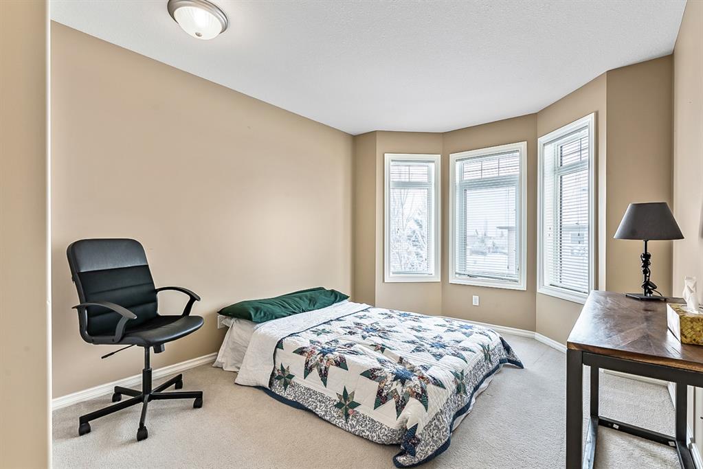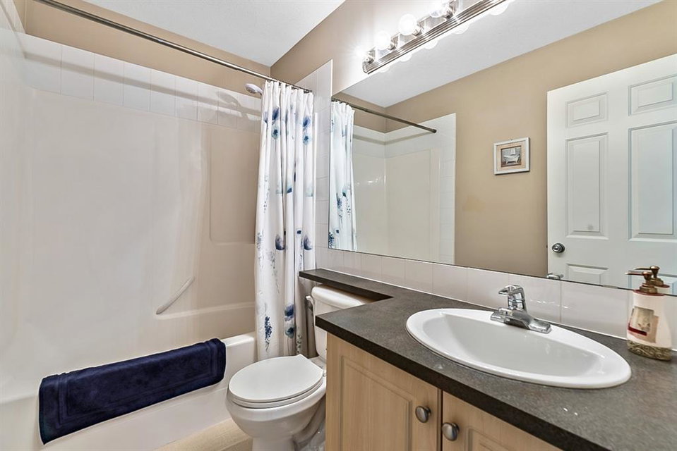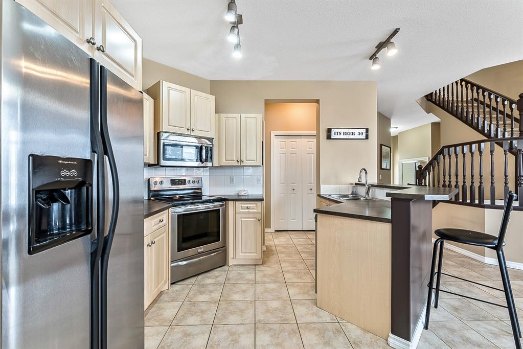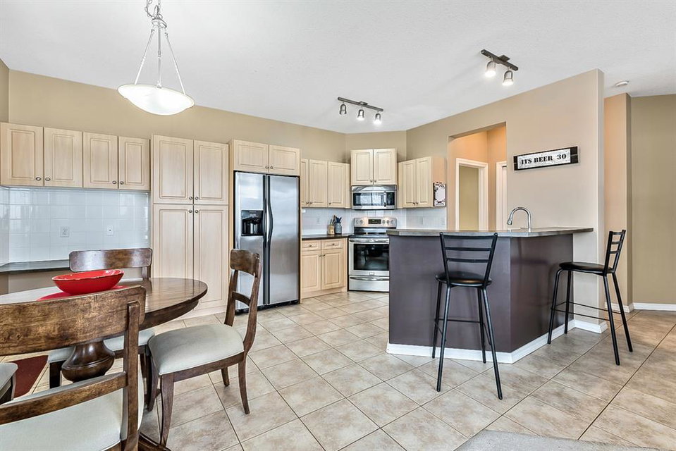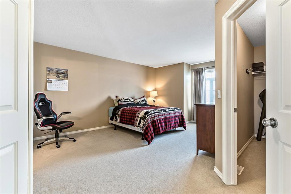 Beautiful END unit located in West Springs with sunny south exposure! This three-bedroom townhouse offers over 2100 sqft of living space with a double attached garage and a fully finished basement. Main floor features large entry way, open concept kitchen, breakfast bar island, stainless steel appliances, dining area, powder room and huge living room that enjoys gas burning fireplace. Three generous sized bedrooms on the upper floor with work-station area and 4pc bath. Master bedroom is massive with a 4pc ensuite that boasts a jetted tub, separate shower, heated tile floors and huge walk-in closet. This home is conveniently located close to abundant green spaces, schools, shopping, public transit, trendy restaurants, quick access to downtown and all major routes. Quick possession is available, if needed. Home shows extremely well with pride of ownership!