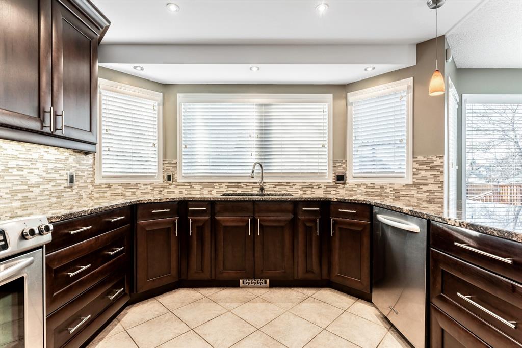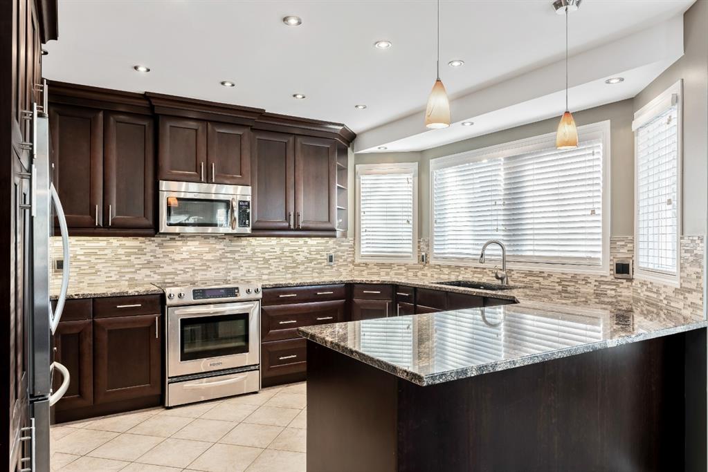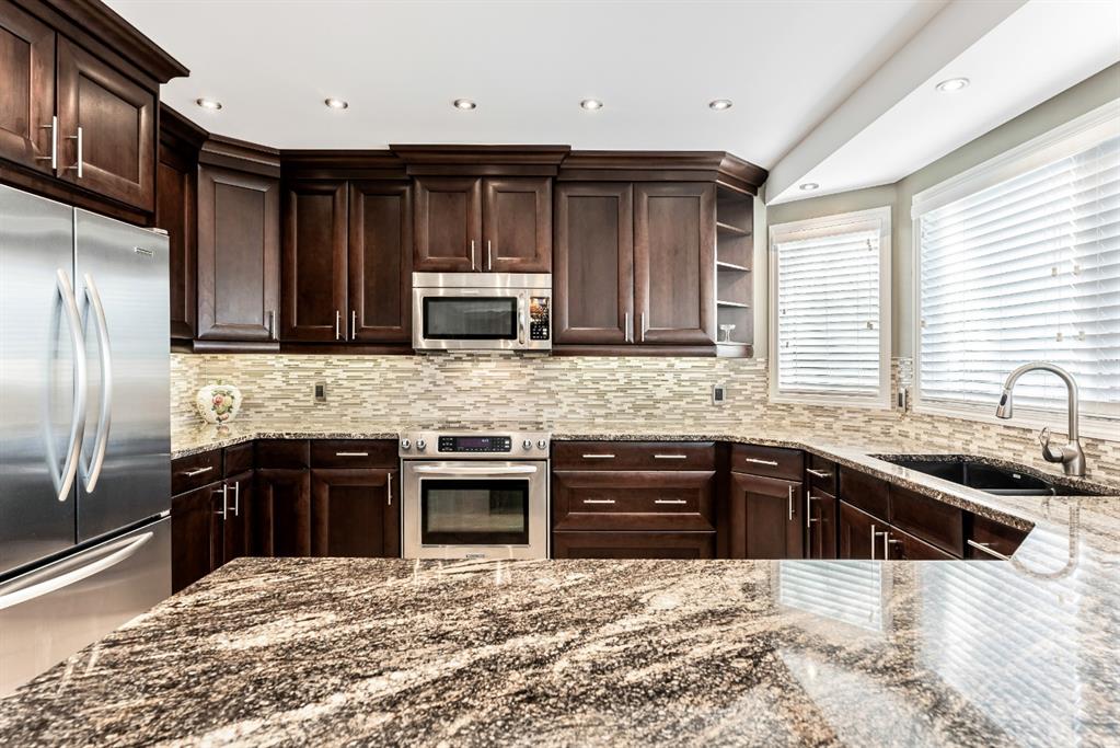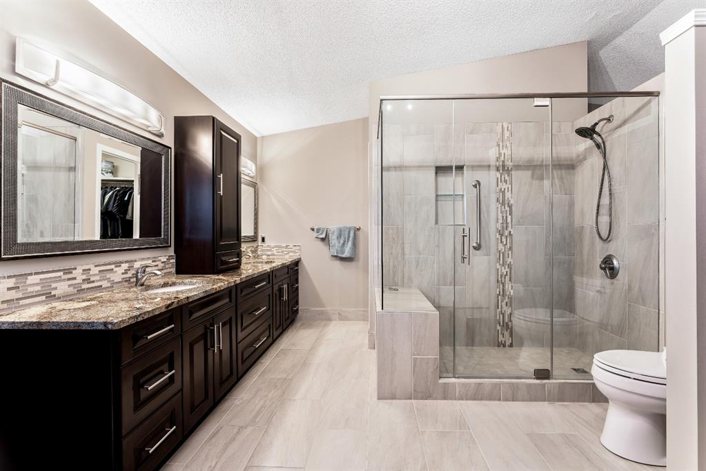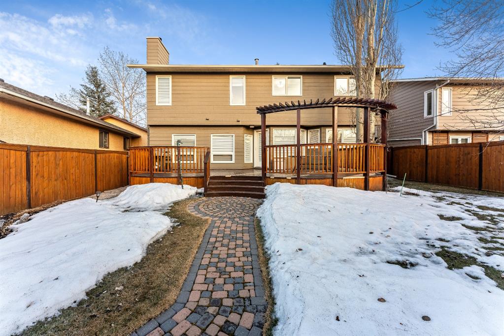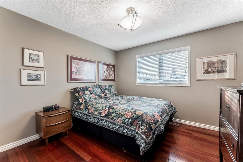 Anything else is a compromise! This fabulous two storey home offers over 2400 sq ft with four bedrooms upstairs. The main and upper floors feature gleaming Brazilian cherry hardwood floors. Main floor displays a large living room, formal dining room, kitchen, breakfast nook, 2pc bathroom, bedroom, and family room. Spacious kitchen boasts high-end granite counter tops, including a beautiful peninsula. Granite continues with a divider cap between the breakfast nook and family room, as well as granite on the wine bar. The main counter is complemented with a trendy tile backsplash and under-cabinet lighting. Kitchen includes a matching stainless-steel refrigerator, dishwasher, microwave, and stove. All this is complemented with a black undermount silgranit sink with a garburator. The family room includes oversized windows, renovated granite wood burning fireplace and attractive glass shelving and cabinets. There are four bedrooms on the upper floor, a renovated 4pc bath, including an oversized master bedroom featuring a gorgeous “spa like” ensuite; (dual sinks, free standing soaker tub, heated tile floors, 10mm glass sided shower and walk-in closet). The lower level is unspoiled and ready for future development. Note: Visit 3D virtual tour, roof shingles updated to 50 yr, central air conditioning, newer exposed and stamped driveway/walkways and underground sprinkler system. Fully landscaped yard that enjoys a massive deck with west exposure perfect for family gatherings and BBQ’s. Walking distance to lake, schools, public transit, shopping, restaurants and Fish Creek Park. These types of homes rarely come on the market!!