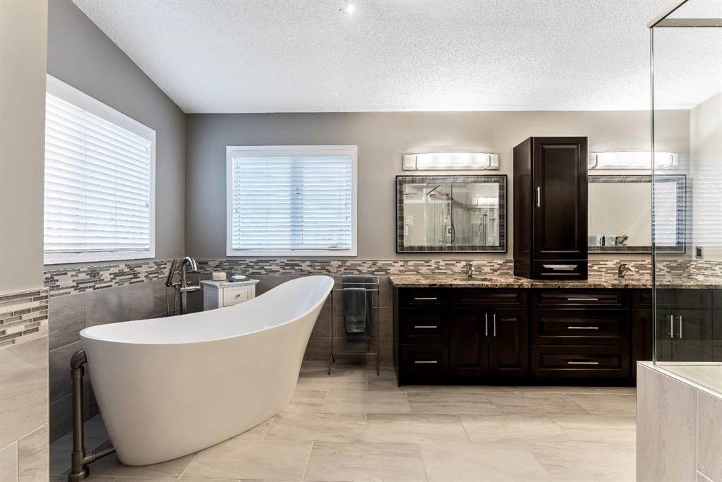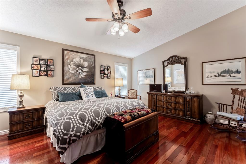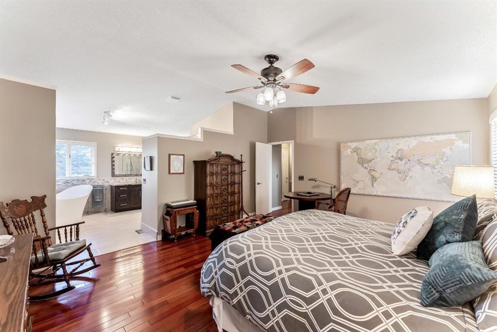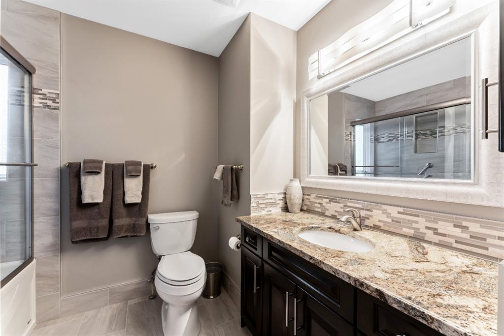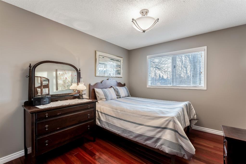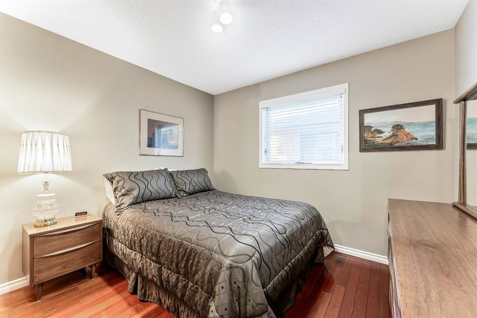 Anything else is a compromise! This fabulous two storey home offers over 2400 sq ft with four bedrooms upstairs. The main and upper floors feature gleaming Brazilian cherry hardwood floors. Main floor displays a large living room, formal dining room, kitchen, breakfast nook, 2pc bathroom, bedroom, and family room. Spacious kitchen boasts high-end granite counter tops, including a beautiful peninsula. Granite continues with a divider cap between the breakfast nook and family room, as well as granite on the wine bar. The main counter is complemented with a trendy tile backsplash and under-cabinet lighting. Kitchen includes a matching stainless-steel refrigerator, dishwasher, microwave, and stove. All this is complemented with a black undermount silgranit sink with a garburator. The family room includes oversized windows, renovated granite wood burning fireplace and attractive glass shelving and cabinets. There are four bedrooms on the upper floor, a renovated 4pc bath, including an oversized master bedroom featuring a gorgeous “spa like” ensuite; (dual sinks, free standing soaker tub, heated tile floors, 10mm glass sided shower and walk-in closet). The lower level is unspoiled and ready for future development. Note: Visit 3D virtual tour, roof shingles updated to 50 yr, central air conditioning, newer exposed and stamped driveway/walkways and underground sprinkler system. Fully landscaped yard that enjoys a massive deck with west exposure perfect for family gatherings and BBQ’s. Walking distance to lake, schools, public transit, shopping, restaurants and Fish Creek Park. These types of homes rarely come on the market!!