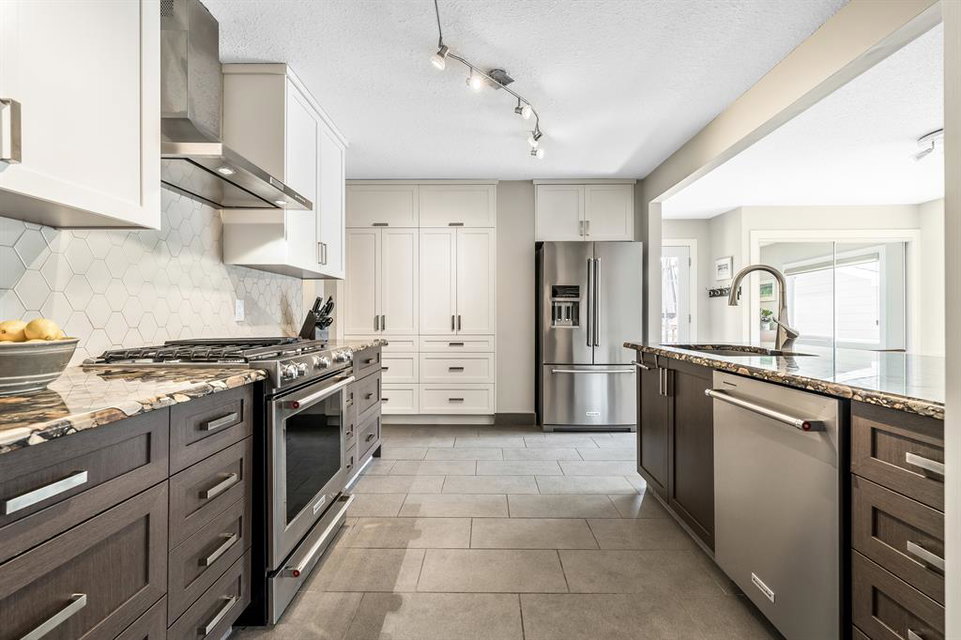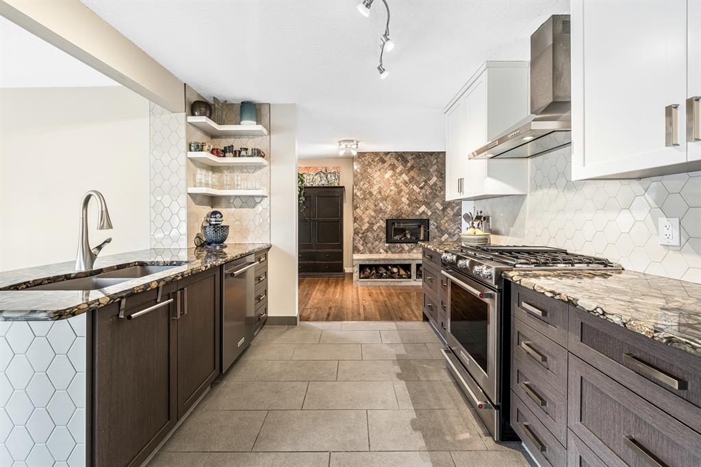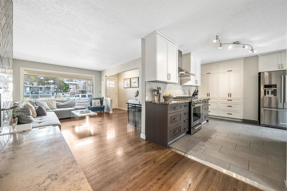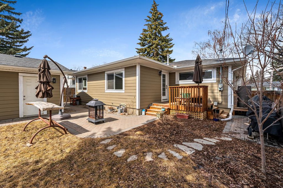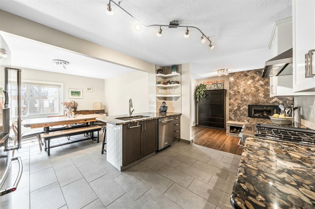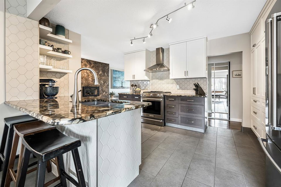 Located in the desirable community of West Haysboro, this is the home you and your family have been waiting for! Boasting over 2400 sq ft of total living space, this beautifully renovated bungalow is sure to impress. Features include 5 bedrooms plus a flex room w/ French doors, 2 full baths, hardwood and heated Italian porcelain flooring, open floor plan, an abundance of natural light, neutral tones throughout, wood fireplace w/ a striking marble/travertine surround and storage hearth and a gourmet kitchen with plenty of contrasting white/dark cabinetry, hidden storage, geometric backsplash, stone countertops, s/s appliances and gas stove. The basement has 2 bedrooms, full bath and a bright rec room with 3 newer large egress windows to really let in the light! Fully landscaped South-facing backyard with deck and lower cobblestone patio and pathway. Location is everything – steps to green space and off-leash park and minutes walk to transit, playgrounds, schools, bike paths around the reservoir, and all shops and amenities that Glenmore Landing has to offer! A great opportunity to purchase a rare larger bungalow, perfect for a family, in such an enviable area!