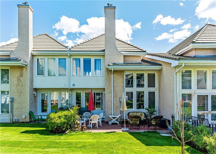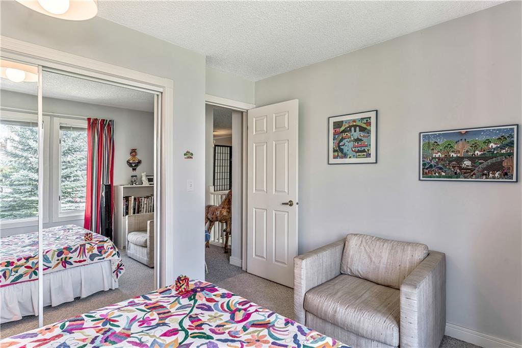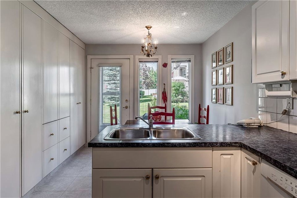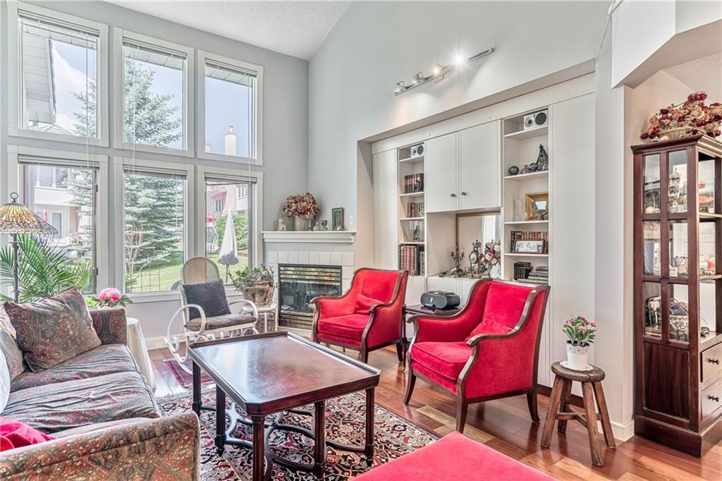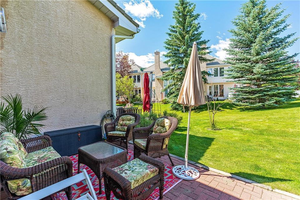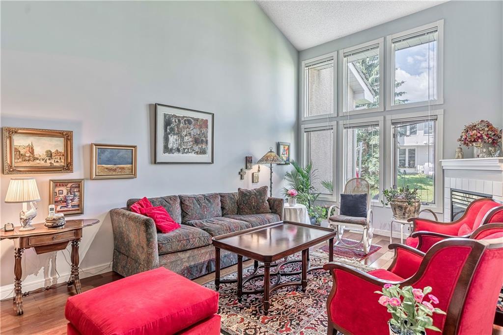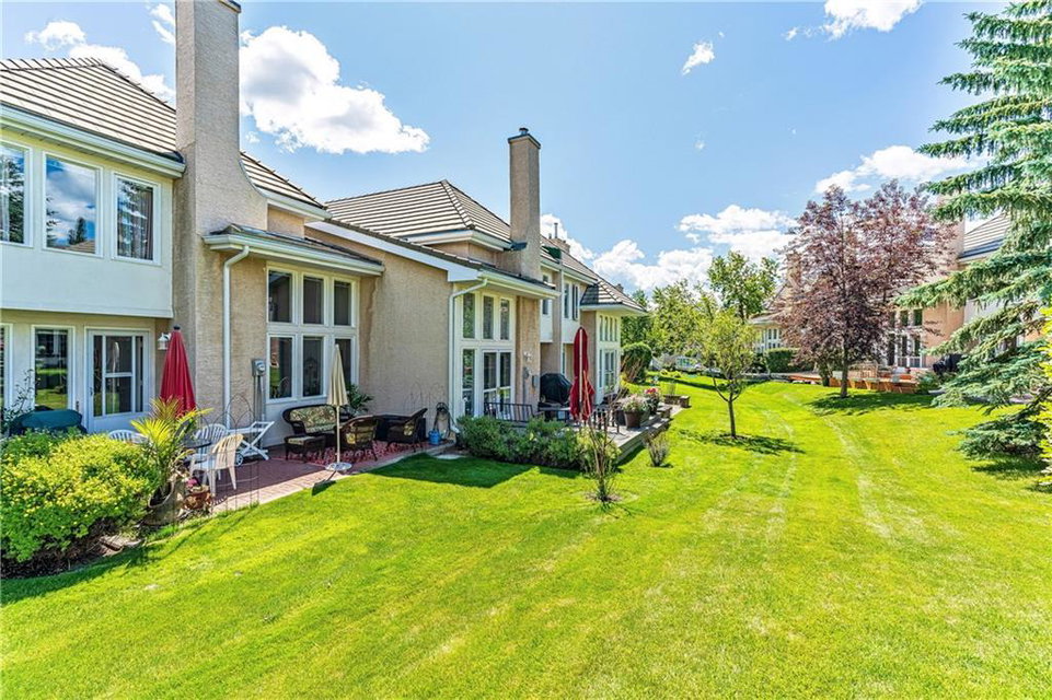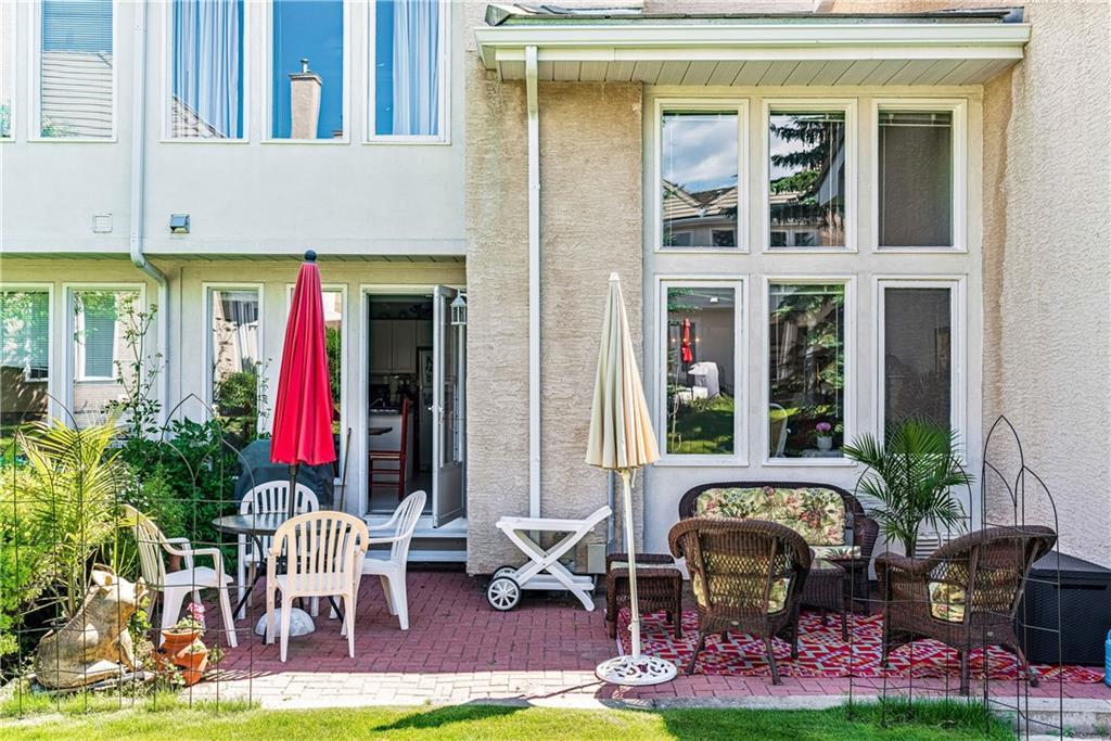 Beautiful maintained executive two storey townhouse with a “special” location backing onto a lovely treed greenspace. Rarely does a unit become available in this desireable complex just steps to Fish Creek Provincial Park which offers stunning mountain views, cycling and walking path, picnic areas-truly outstanding within a city environment. Main floor offers open vaulted living room with floor to ceiling windows for optimal sunlight, cozy corner gas fireplace, access to a wonderful west facing patio, entertaining sized dining room, functional kitchen with white cabinets, eating bar & nook, wall storage cabinets plus gleaming hardwood floors, access to double attached insulated garage, 2pc powder & stunning foyer. Upper floor features king sized master bedroom, large open loft/den (can be converted to 3rd bedroom), 3pc bath & laundry area. lower level is fully developed with 2pc bath, large rec. room, storage/workshop and storage. Great opportunity if you are downsizing to own in this classy complex!!