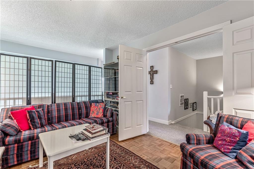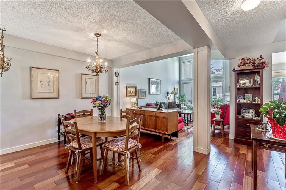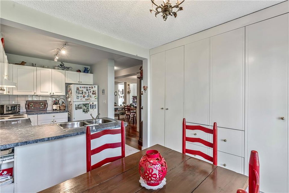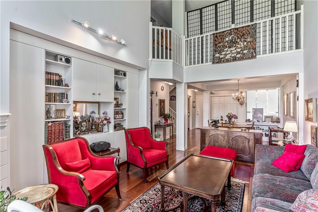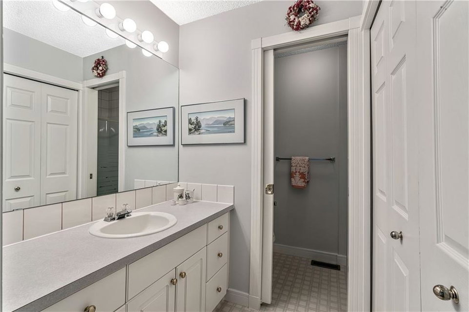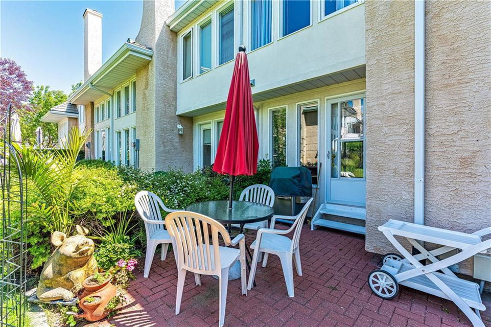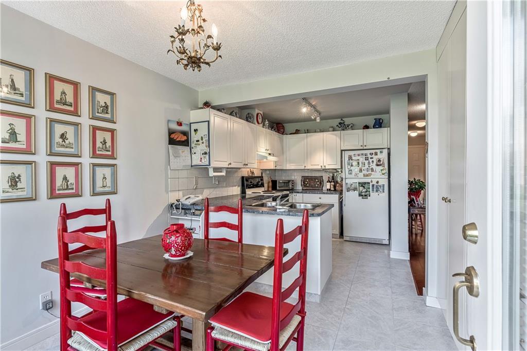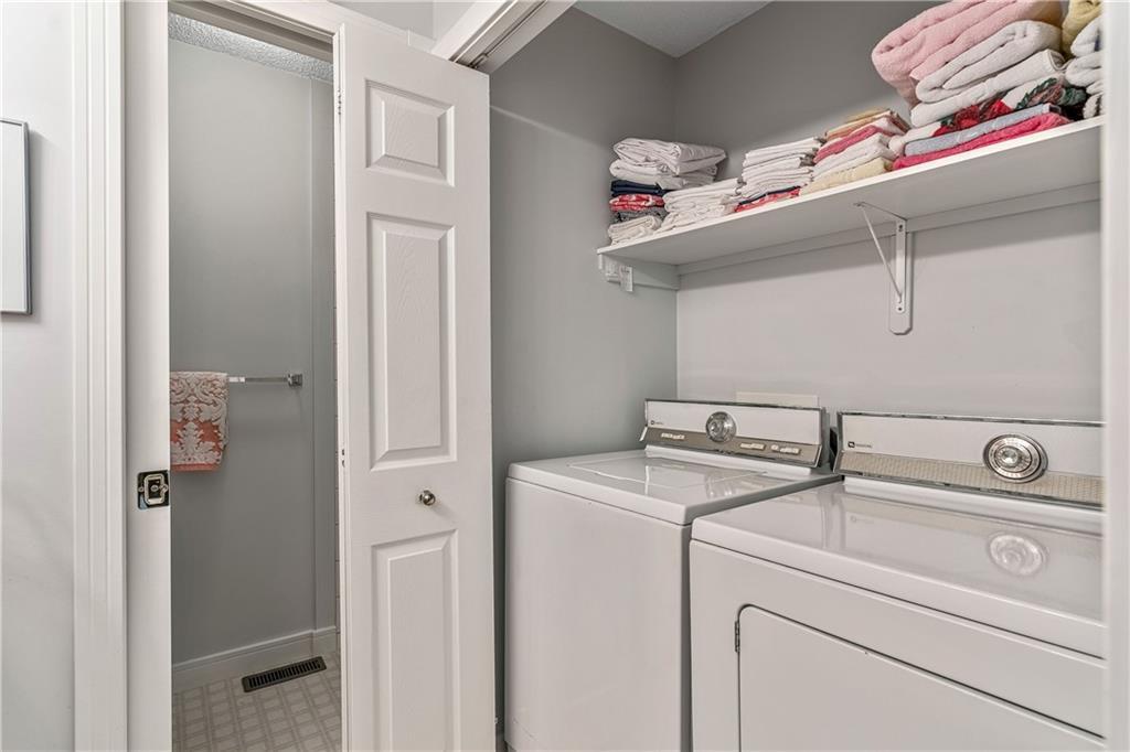 Beautiful maintained executive two storey townhouse with a “special” location backing onto a lovely treed greenspace. Rarely does a unit become available in this desireable complex just steps to Fish Creek Provincial Park which offers stunning mountain views, cycling and walking path, picnic areas-truly outstanding within a city environment. Main floor offers open vaulted living room with floor to ceiling windows for optimal sunlight, cozy corner gas fireplace, access to a wonderful west facing patio, entertaining sized dining room, functional kitchen with white cabinets, eating bar & nook, wall storage cabinets plus gleaming hardwood floors, access to double attached insulated garage, 2pc powder & stunning foyer. Upper floor features king sized master bedroom, large open loft/den (can be converted to 3rd bedroom), 3pc bath & laundry area. lower level is fully developed with 2pc bath, large rec. room, storage/workshop and storage. Great opportunity if you are downsizing to own in this classy complex!!